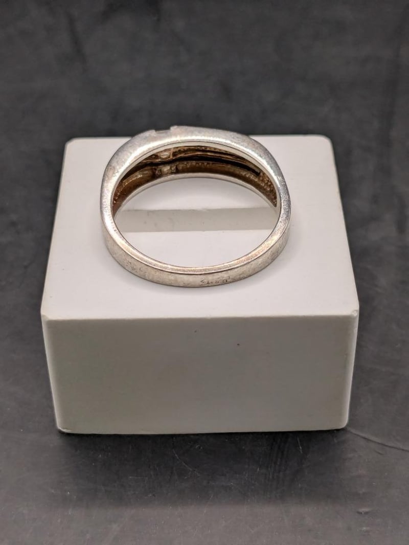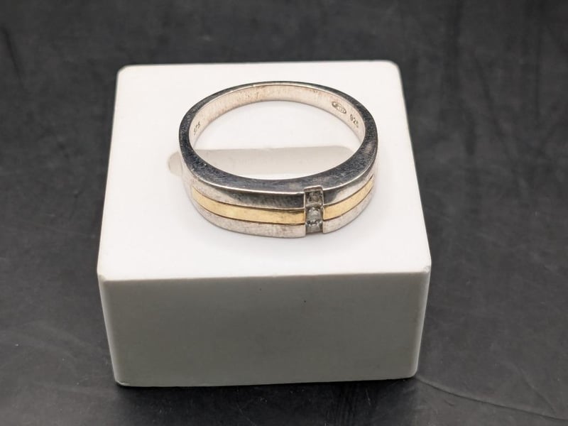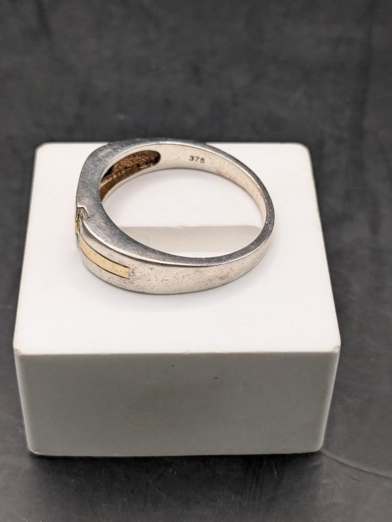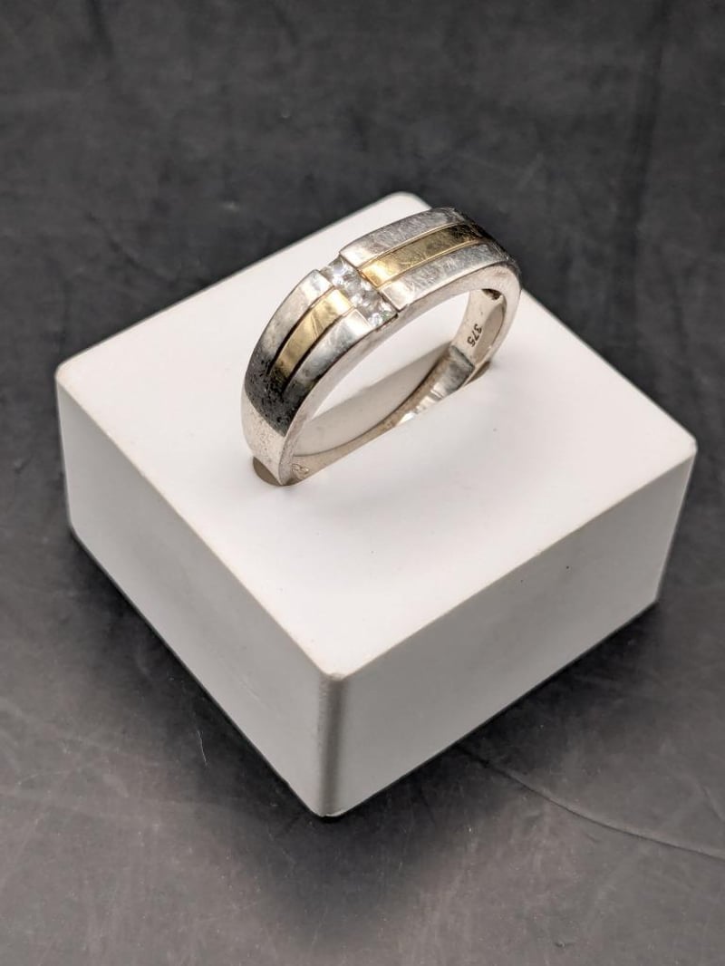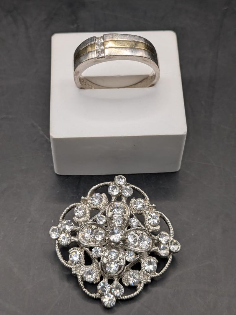 Jewellery, including men's two-tone ring gold and silver style hallmarked 375, 925 JP137, set with 3 stones, size T 1/2 and 1 x rhinestone brooch Sold as lot