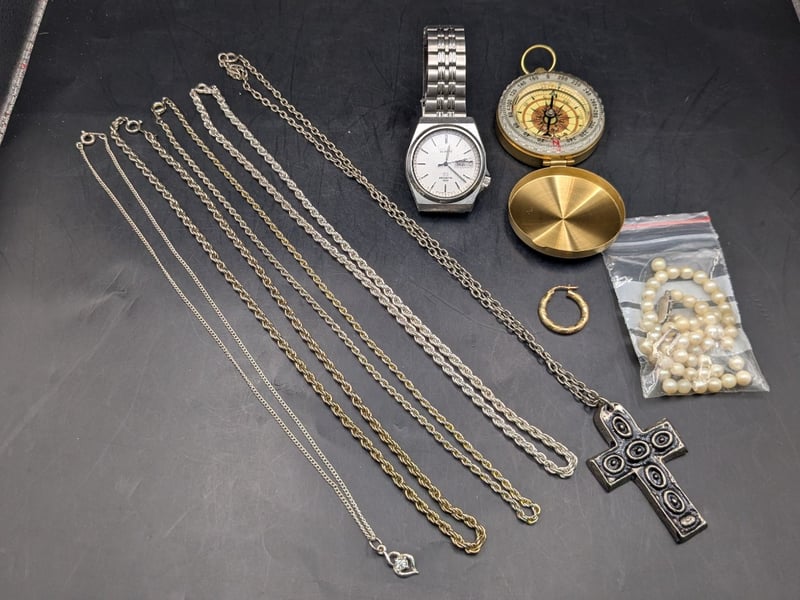Jewellery, including Seiko SQ Sports 100 quartz watch with a silver dial and metal bracelet, necklaces and more