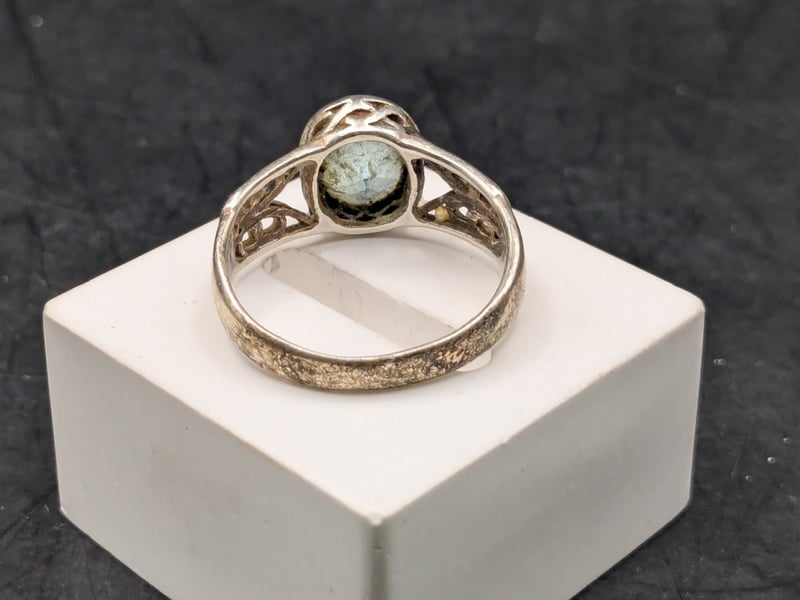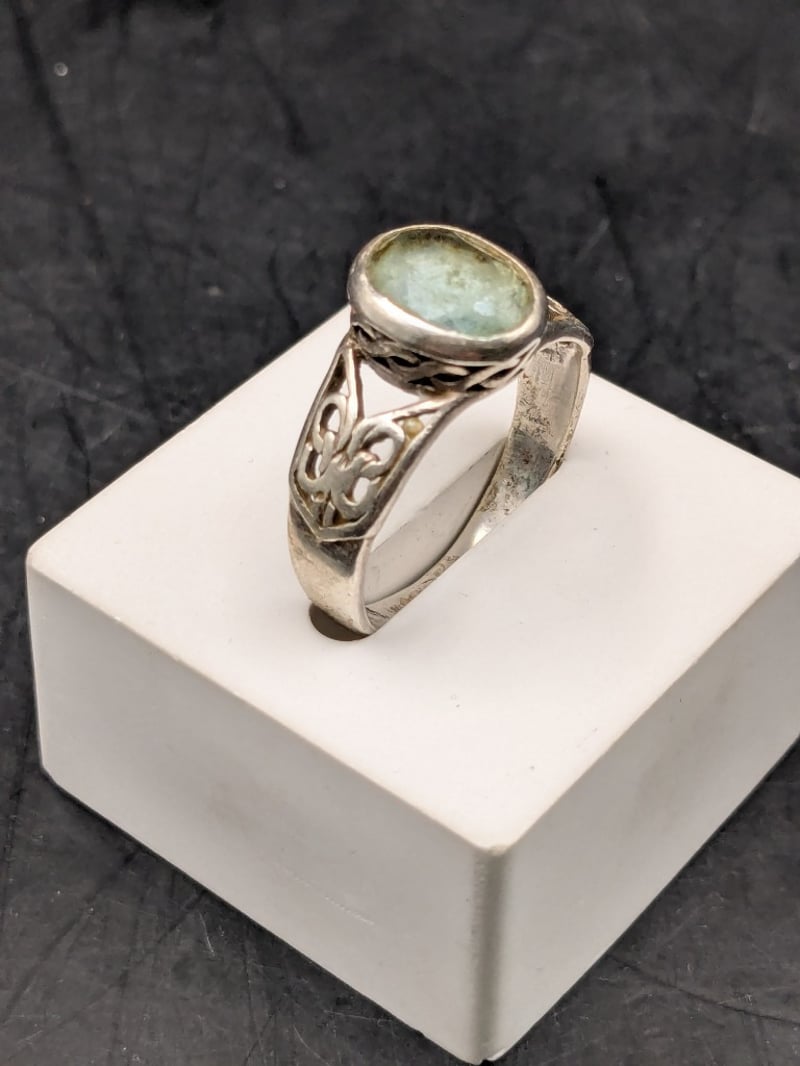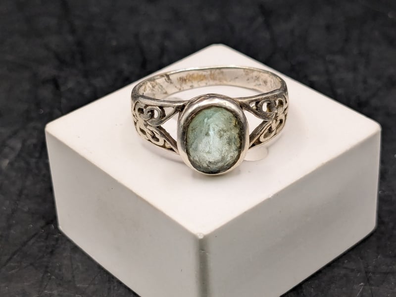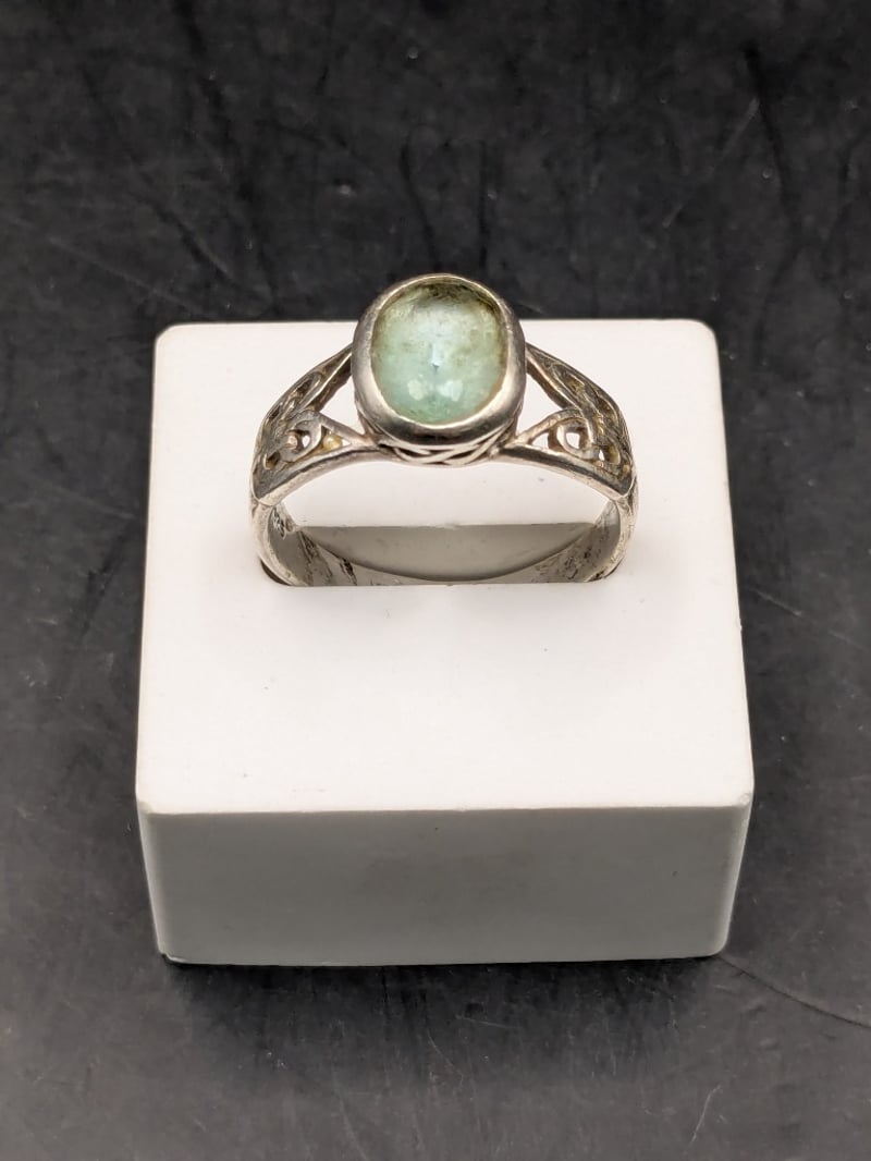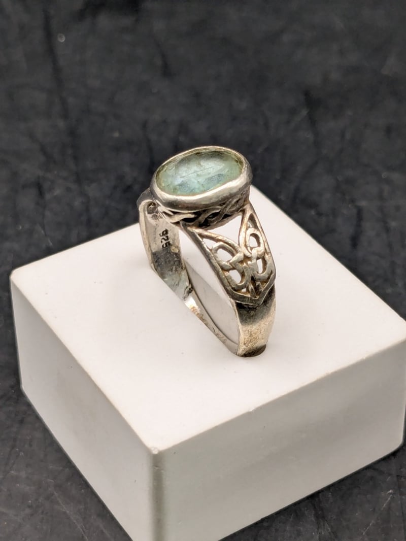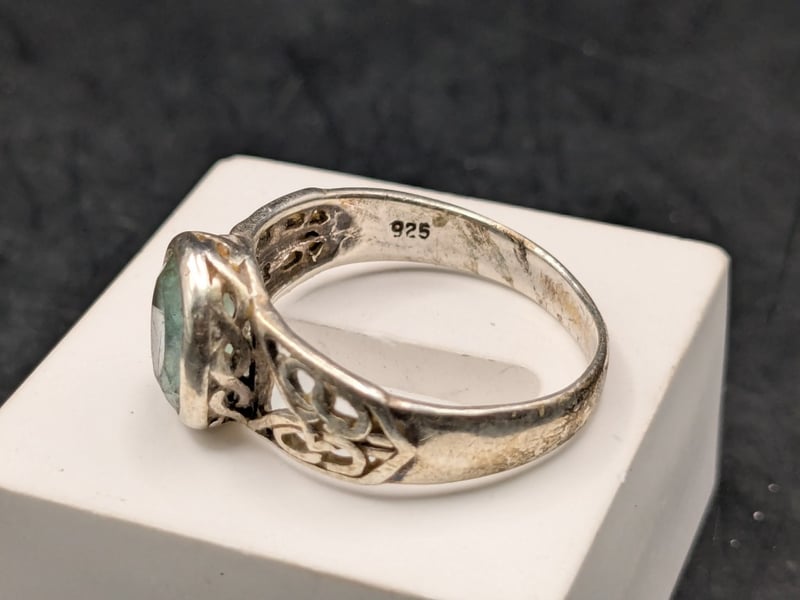 Ring, sterling silver style ring hallmarked 925 set with a light blue stone. The band features detailed cut-out or filigree scrollwork on the sides, size S