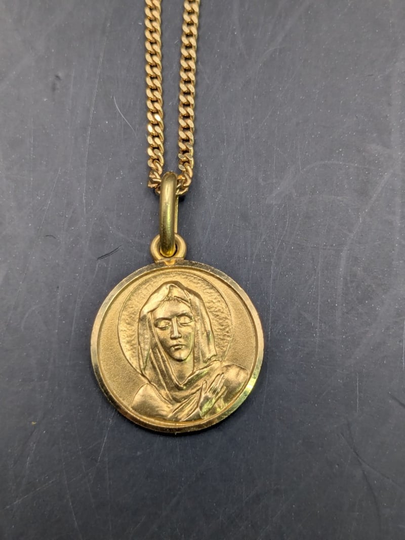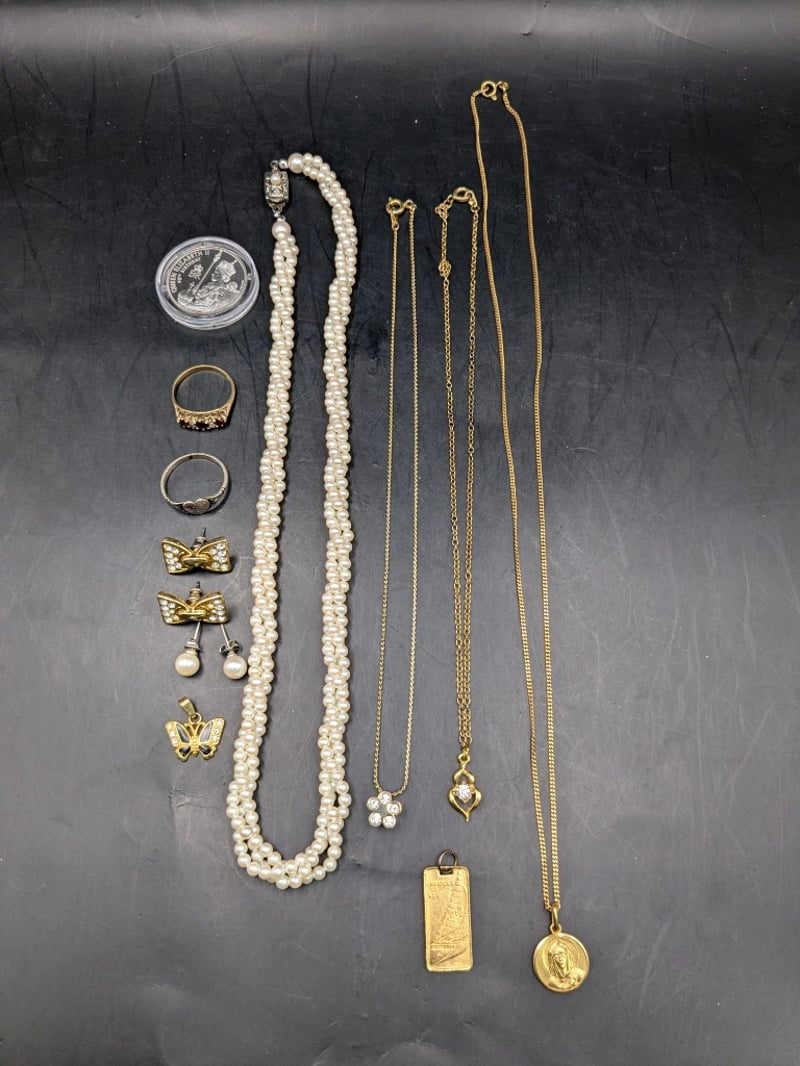 Jewellery, including gold style religious pendent and necklace hallmarked 750, commemorative medallion for the 1983 America's Cup win by the yacht Australia II and more Sold as lot