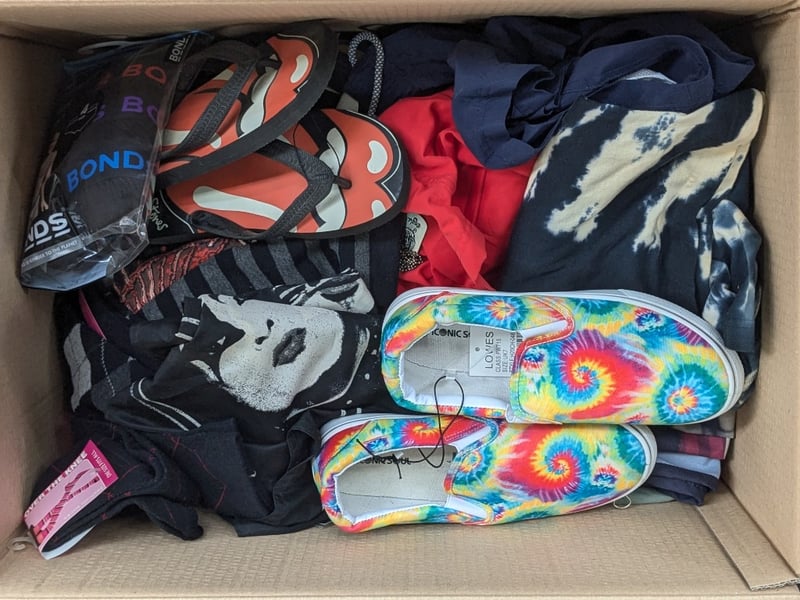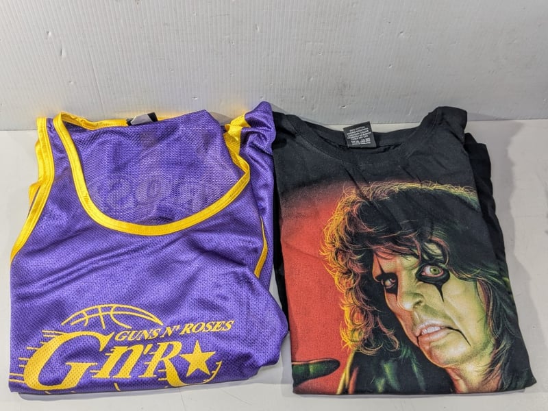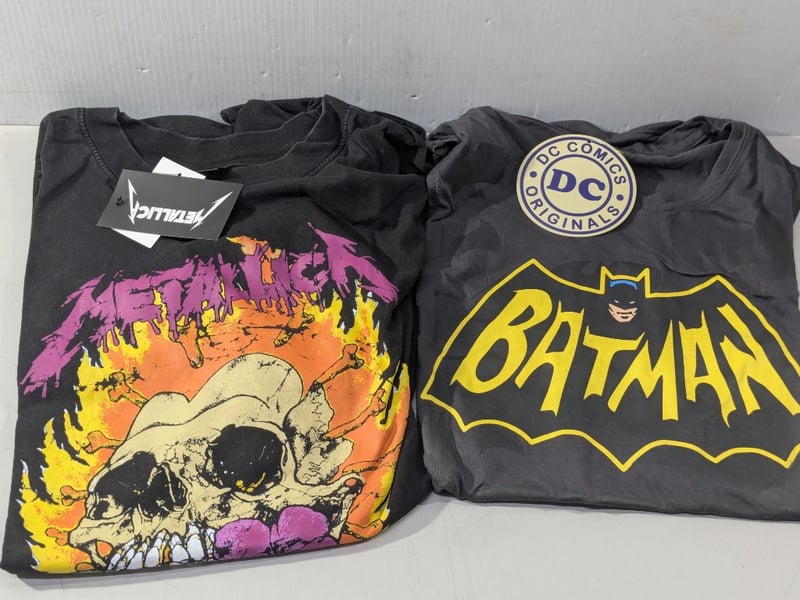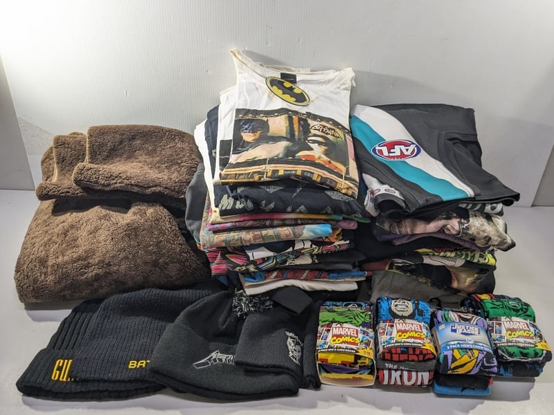 Clothing, 2 boxes including graphic shirts, jumpers, socks and more, sizes mostly XL and L