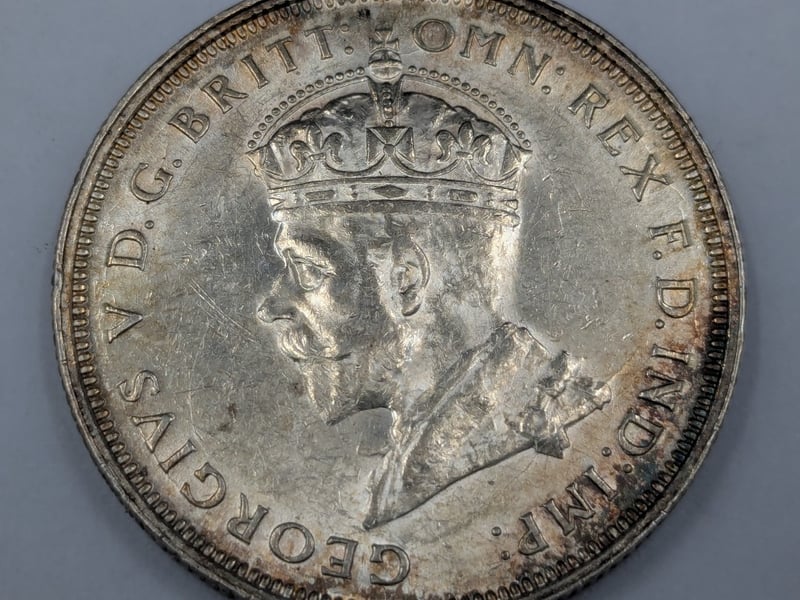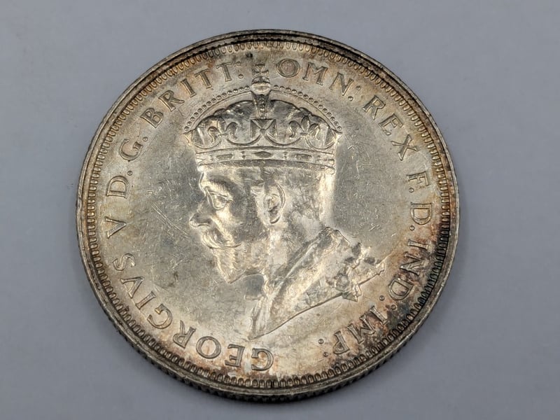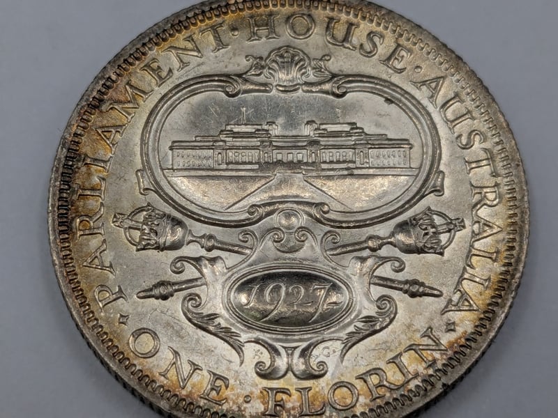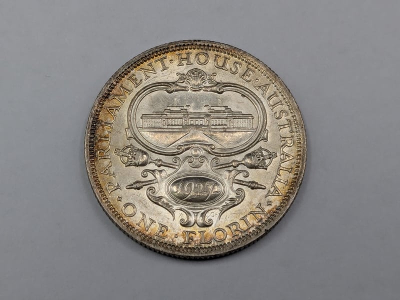 Coin, Australian 1927 Canberra Florin, a commemorative coin featuring the original Parliament House building