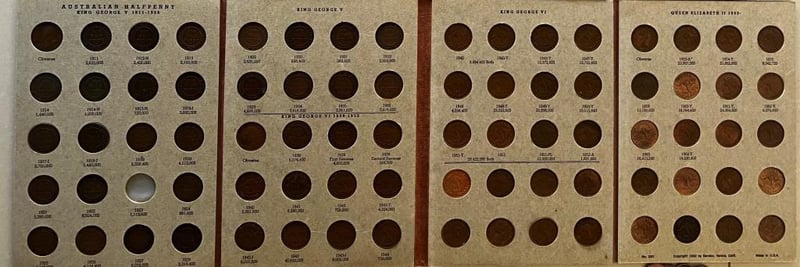 COMPLETE AUSTRALIA PRE DECIMAL COOPER HALF PENNIES SET OF 71 COINS, WHICH HAS ALL THE DATE EXCLUDING 1923 HALF PENNY, HALF PENNY ALBUM HAS SOME WEAR & TEAR AS THE ALBUM. ALSO HAS MARK & TAPE 311154+25