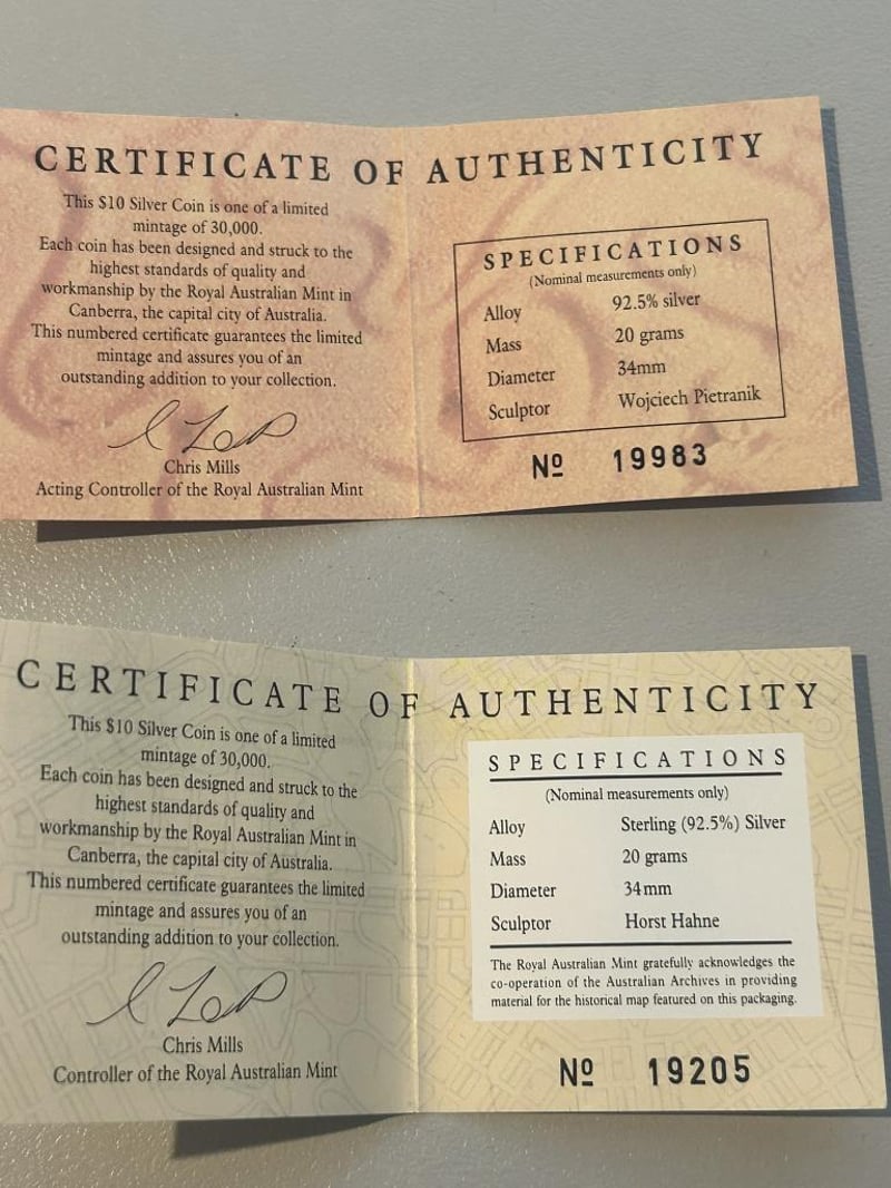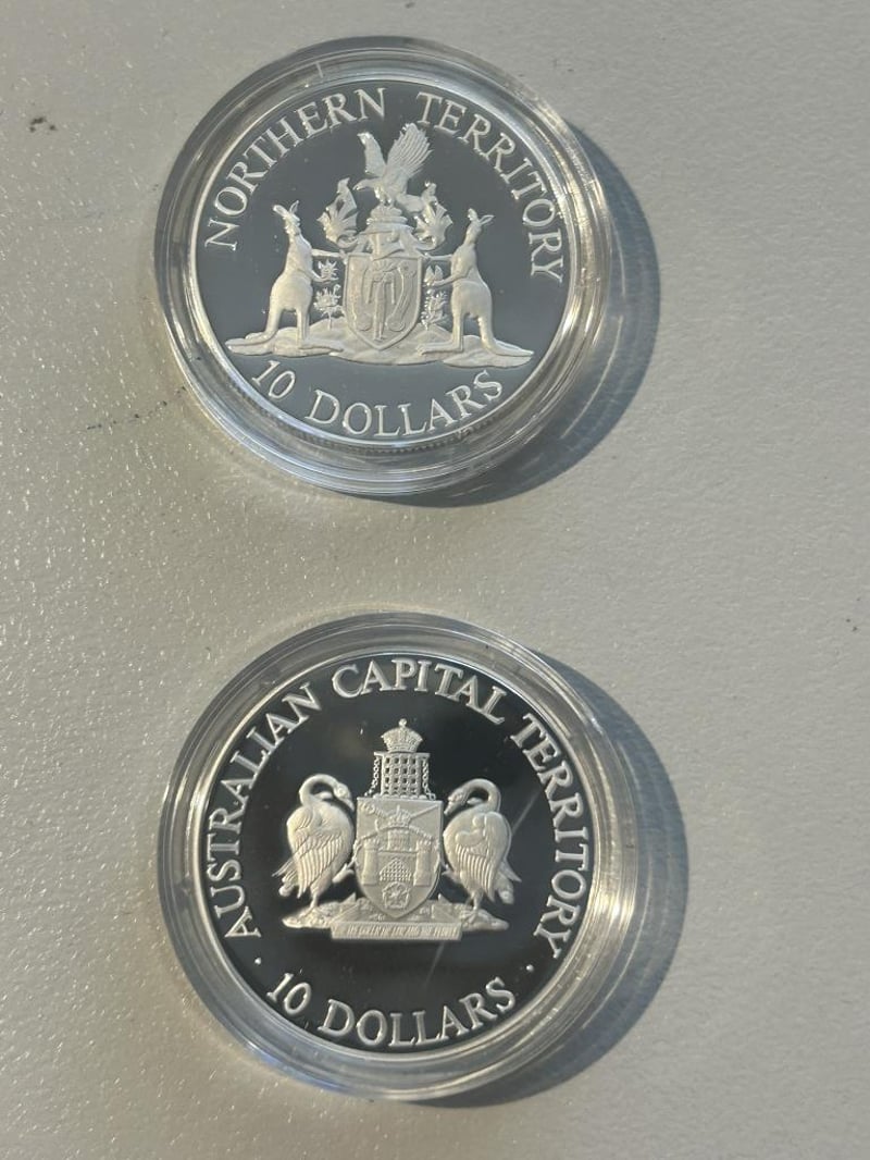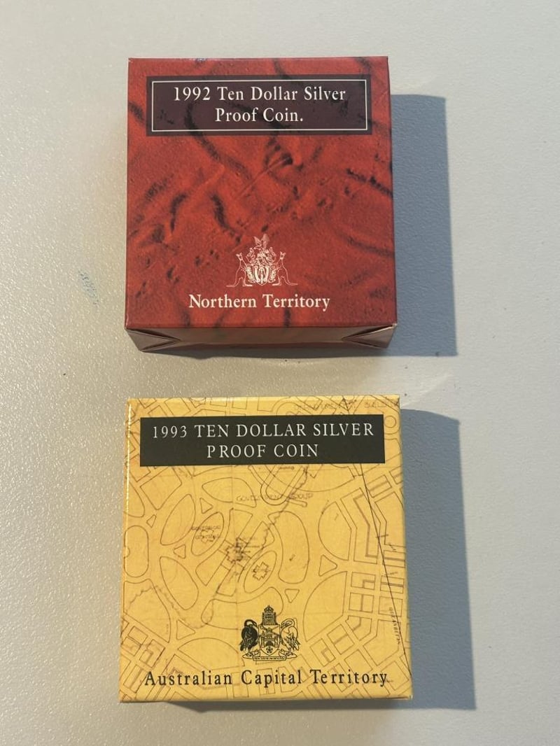 1992 $ 1994 TEN DOLLAR NORTHERN TERRITORY AND ACT SILVER PROOF COINS IN CASE