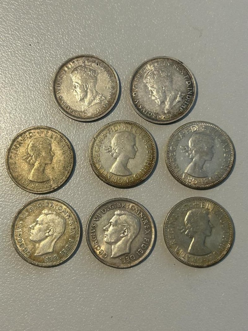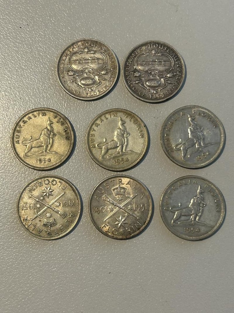 9 X FLORINS 2 X 1937 MELBOURNE,2 X 1951 JUILBEE, 4 X 1954 ROYAL VISIT 90 Grames In Total 233489+44