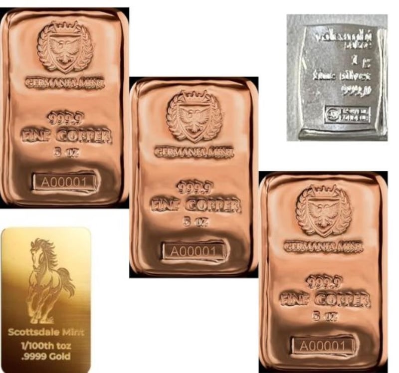 5 OUNCE GERMANIA MINT PREMIUM COPPER BAR X 3, 1/100 OUNCE SCOTTDALE GOLD BER X 1 AND 1 GRAM SILVER VALCUMBI BAR X 1
