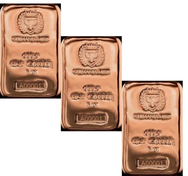 5 OUNCE GERMANIA MINT INVESTMENT GRADE COPPER BARS X 3