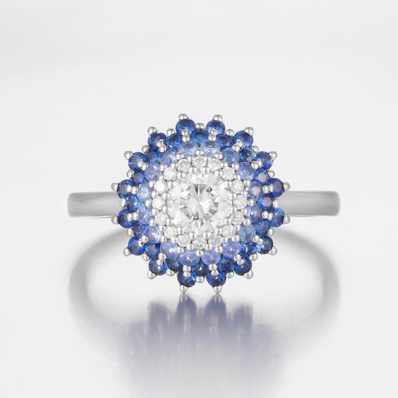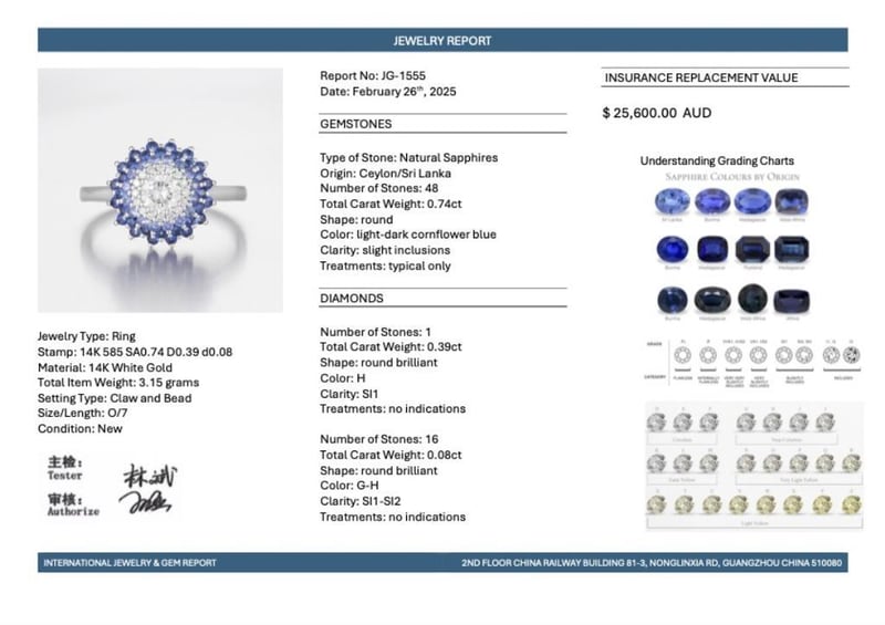 14CT WHITE GOLD CEYLON SAPPHIRE AND DIAMOND DOUBLE HALO RING Featuring Centre, One Round Brilliant Cut Diamond (0.39Ct, H Colour, Si1 Clarity), Claw Set, With 16 Round Brilliant Cut Diamonds (0.08Ct Tdw, G-H Colour, Si1-Si2 Clarity), Bead Set, And 48 Round Cut, Light-Dark Cornflower Blue Ceylon Sapphires (0.74Ct Tsw, Slight Inclusions), Claw Set. Ring Size O. Valuations Provided by an Independent Third-Party Professional Not Directly Associated With Lloyds Auctions at AUD $25600This valuation has been conducted by an independent third-party professional. The valuation amount is an assessment by the issuing valuer and does not reflect the auction value of the item. Any inquiries regarding the valuation should be directed to the issuing valuer (refer to contact details on the certificate), as Lloyds Auctions has no affiliation or influence over the valuation, the valuer, or the stated amount. Condition: Good - Refer Images 0+598