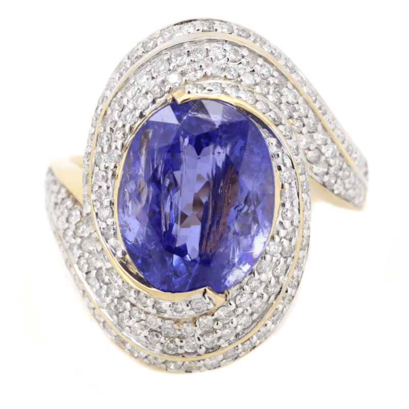 14K YELLOW GOLD, TANZANITE AND DIAMOND, STATEMENT RING. The Centre Design Features, One Oval Cut, Moderate Vivid Blue, Tanzanite (5.76Ct, Naturally Included), Claw Set. Surrounding The Centre Design Are, 165 Round Brilliant Cut, Diamonds (0.83Ct Tdw, G-H Colour, Si2-P1 Clarity), Bead Set In White Gold. Ring Size O1/2 Valuations Provided by an Independent Third-Party Professional Not Directly Associated With Lloyds Auctions at AUD $$20,000.00This valuation has been conducted by an independent third-party professional. The valuation amount is an assessment by the issuing valuer and does not reflect the auction value of the item. Any inquiries regarding the valuation should be directed to the issuing valuer (refer to contact details on the certificate), as Lloyds Auctions has no affiliation or influence over the valuation, the valuer, or the stated amount. Condition: Good - Refer Images 0+5305