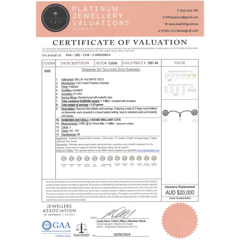 14K WHITE GOLD, 1.40CT TDW DIAMOND, SOLITAIRE STUD EARRINGS. The Studs Feature, 2 Round Brilliant Cut, Diamonds (1.40Ct Tdw, J Colour, Si1-P2+ Clarity), Bezel Set. The Earrings Have Post Backs, With 14K White Gold Butterfly Clasps. Valuations Provided by an Independent Third-Party Professional Not Directly Associated With Lloyds Auctions at AUD $$20,000.00This valuation has been conducted by an independent third-party professional. The valuation amount is an assessment by the issuing valuer and does not reflect the auction value of the item. Any inquiries regarding the valuation should be directed to the issuing valuer (refer to contact details on the certificate), as Lloyds Auctions has no affiliation or influence over the valuation, the valuer, or the stated amount. Condition: Good - Refer Images 0+5320