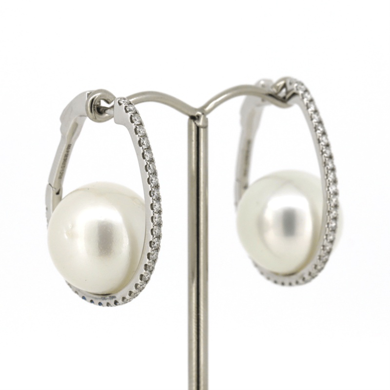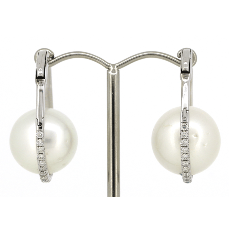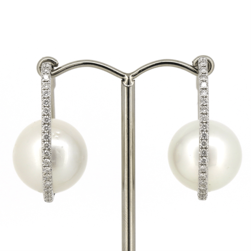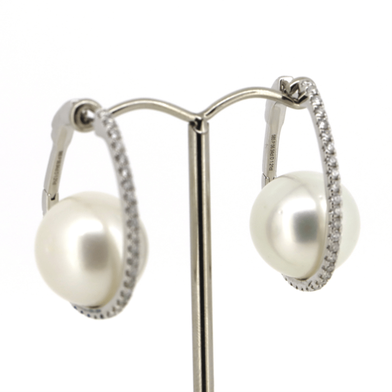 14K WHITE GOLD, OFF-WHITE CULTURED SOUTH SEA PEARL AND DIAMOND, HOOP EARRINGS. The Design Features, 2 Round, Off-White, Cultured South Sea Pearls (15.00Mm Size, Aa Grade, Few Blemishes), Half Drilled/Cap Set. Accompanying The Design Are, 66 Round Brilliant Cut, Diamonds (1.21Ct Tdw, H-K Colour, P1+ Clarity), Bead Set. The Earrings Have Fancy Hinged-Clip Huggie Closures. Valuations Provided by an Independent Third-Party Professional Not Directly Associated With Lloyds Auctions at AUD $$19,500.00This valuation has been conducted by an independent third-party professional. The valuation amount is an assessment by the issuing valuer and does not reflect the auction value of the item. Any inquiries regarding the valuation should be directed to the issuing valuer (refer to contact details on the certificate), as Lloyds Auctions has no affiliation or influence over the valuation, the valuer, or the stated amount. Condition: Good - Refer Images 0+5330