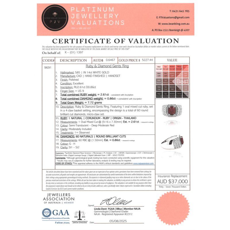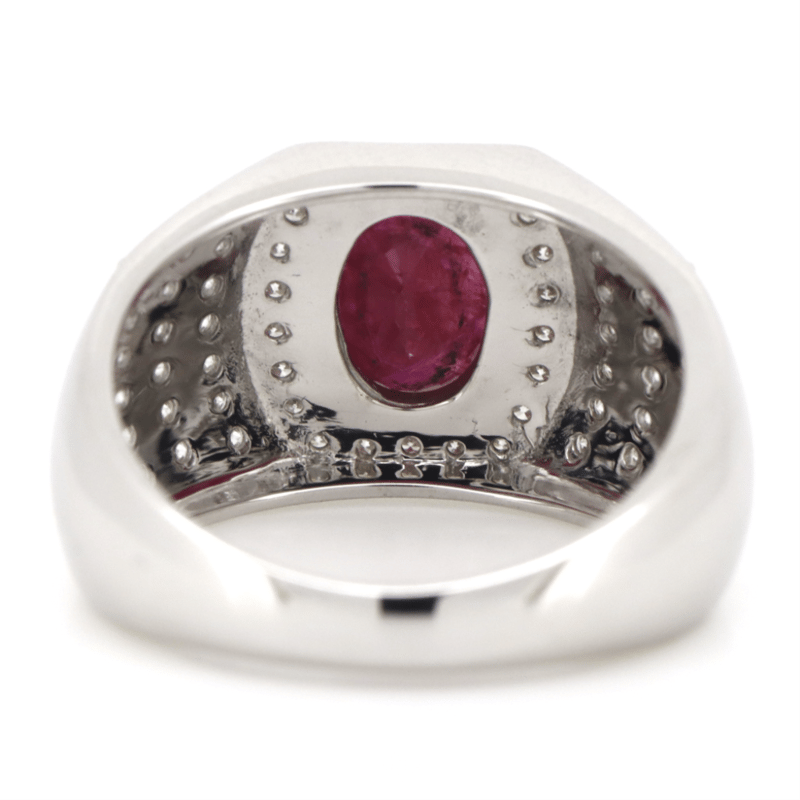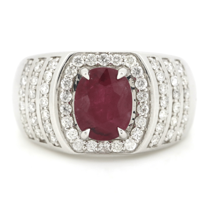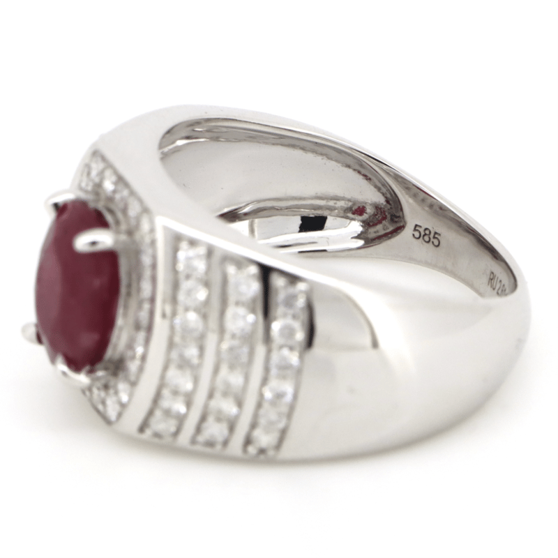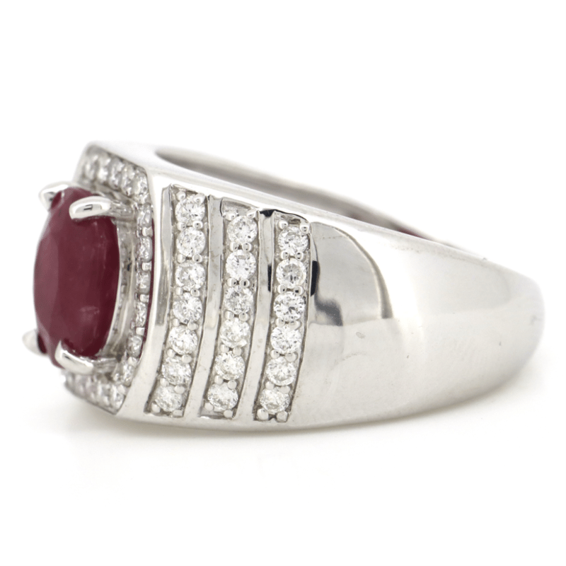 14K WHITE GOLD, RUBY AND DIAMOND, GENTS RING. The Centre Features, One Oval Cut, Deep Moderate Red, Ruby (2.61Ct,Moderately Included), 4 Claw Set. Encompassing The Centre Are, 60 Round Brilliant Cut, Diamonds (0.86Ct Tdw, G-H Colour, Si1-Si2 Clarity), Micro-Claw Set. Ring Size R 1/2. Valuations Provided by an Independent Third-Party Professional Not Directly Associated With Lloyds Auctions at AUD $$37,000.00This valuation has been conducted by an independent third-party professional. The valuation amount is an assessment by the issuing valuer and does not reflect the auction value of the item. Any inquiries regarding the valuation should be directed to the issuing valuer (refer to contact details on the certificate), as Lloyds Auctions has no affiliation or influence over the valuation, the valuer, or the stated amount. Condition: Good - Refer Images 0+5307