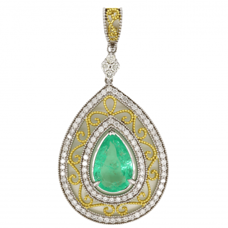 14K WHITE/YELLOW GOLD, 4.49CT COLOMBIAN EMERALD AND DIAMOND, PENDANT. The Centre Features, One Pear Mixed Cut, Light Vivid Mint Green, Colombian Emerald (4.49Ct, Moderately Included), 3 Claw Set. Surrounding The Centre In A Double Halo Are, 94 Round Brilliant Cut, Diamonds (1.66Ct Tdw, H-J Colour, P3+ Clarity), Bead/Pip-Claw Set. Valuations Provided by an Independent Third-Party Professional Not Directly Associated With Lloyds Auctions at AUD $$74,000.00This valuation has been conducted by an independent third-party professional. The valuation amount is an assessment by the issuing valuer and does not reflect the auction value of the item. Any inquiries regarding the valuation should be directed to the issuing valuer (refer to contact details on the certificate), as Lloyds Auctions has no affiliation or influence over the valuation, the valuer, or the stated amount. Condition: Good - Refer Images 0+5344