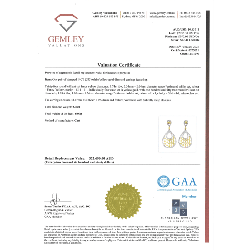 14K WHITE/YELLOW GOLD, FANCY YELLOW DIAMOND AND DIAMOND, DROP EARRINGS. The Earrings Feature, 34 Round Brilliant Cut, Fancy Yellow, Diamonds (1.74Ct Tdw, Si1-I1 Clarity), 4 Claw Set In Yellow Gold. Decorating The Halos Are, 152 Round Brilliant Cut, Diamonds (1.24Ct Tdw, H-J Colour, Si-I1 Clarity), Claw Set. The Earrings Have Post-Backs, With 14K White Gold Butterfly Clasps. Valuations Provided by an Independent Third-Party Professional Not Directly Associated With Lloyds Auctions at AUD $$22,690.00This valuation has been conducted by an independent third-party professional. The valuation amount is an assessment by the issuing valuer and does not reflect the auction value of the item. Any inquiries regarding the valuation should be directed to the issuing valuer (refer to contact details on the certificate), as Lloyds Auctions has no affiliation or influence over the valuation, the valuer, or the stated amount. Condition: Good - Refer Images 0+5326