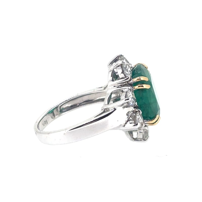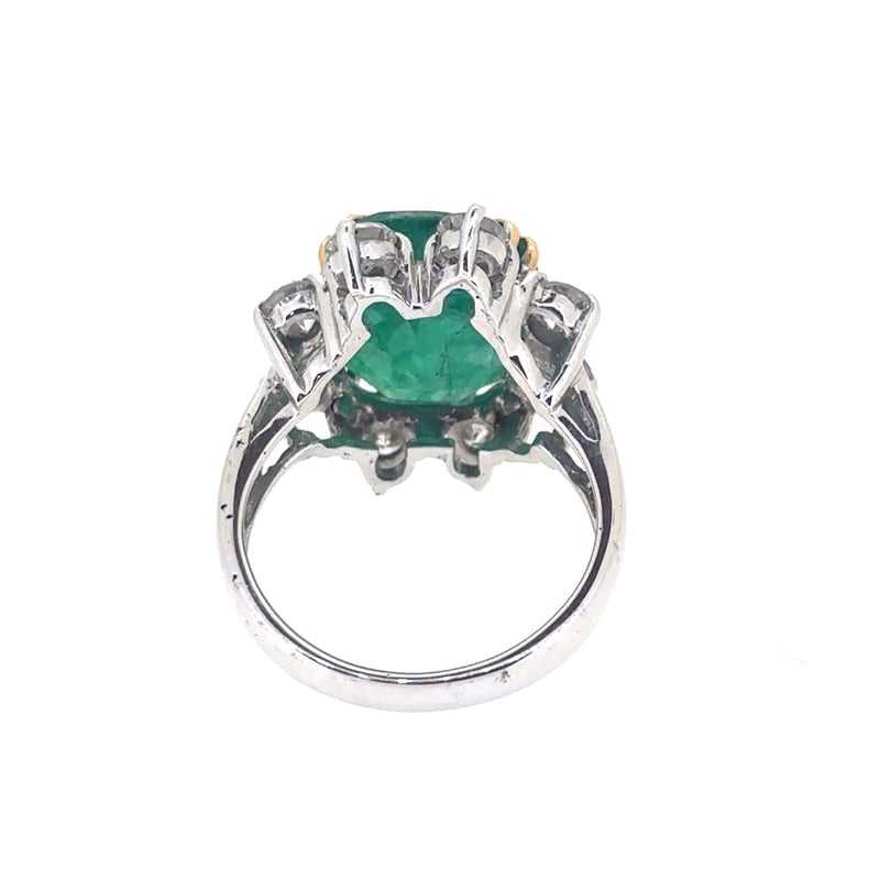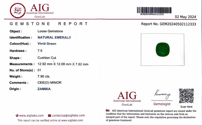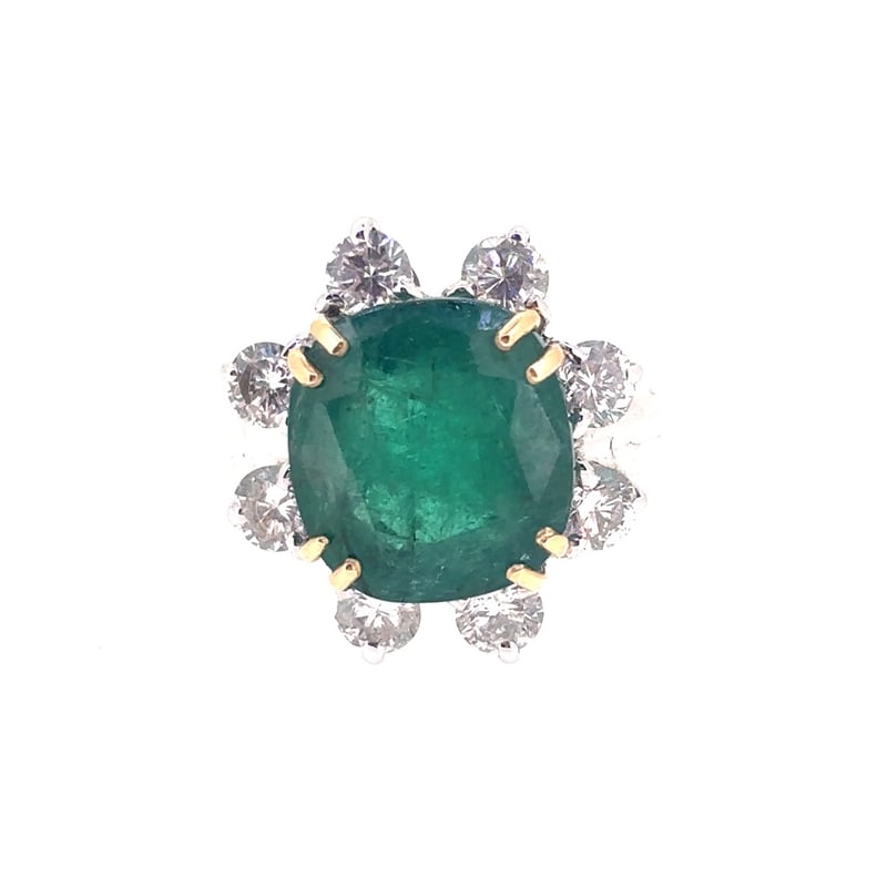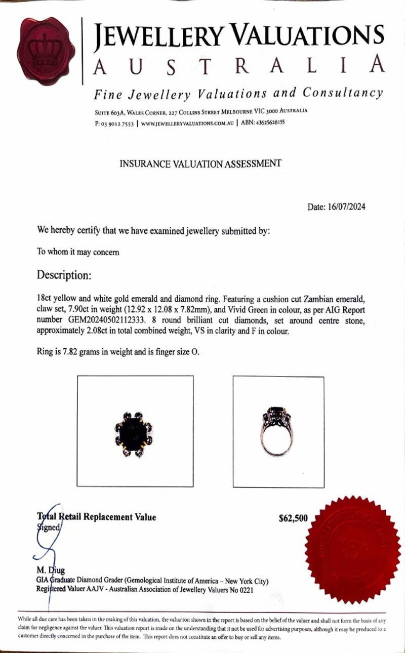 18CT YELLOW AND WHITE GOLD EMERALD AND DIAMOND RINGFeaturing A Cushion Cut Zambian Emerald, Claw Set, 7.90Ct In Weight (12.92 X 12.08 X 7.82Mm), And Vivid Green In Colour, As Per Aig Report Number Gem20240502112333. 8 Round Brilliant Cut Diamonds, Set Around Centre Stone, Approximately 2.08Ct In Total Combined Weight, Vs In Clarity And F In Colour. Finger Size O.Total Item Weight: 7.82gCondition: Good - Refer To ImagesThis valuation has been conducted by an independent third-party professional. The valuation amount is an assessment by the issuing valuer and does not reflect the auction value of the item.Any inquiries regarding the valuation should be directed to the issuing valuer (refer to contact details on the certificate), as Lloyds Auctions has no affiliation or influence over the valuation, the valuer, or the stated amount.Insurance Replacement Valuation Amount: $62,500.00CROSSDOCK163029+8