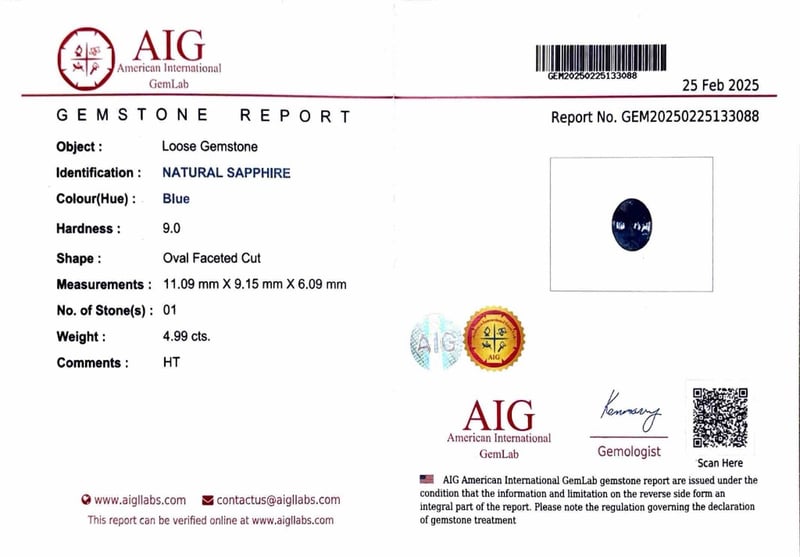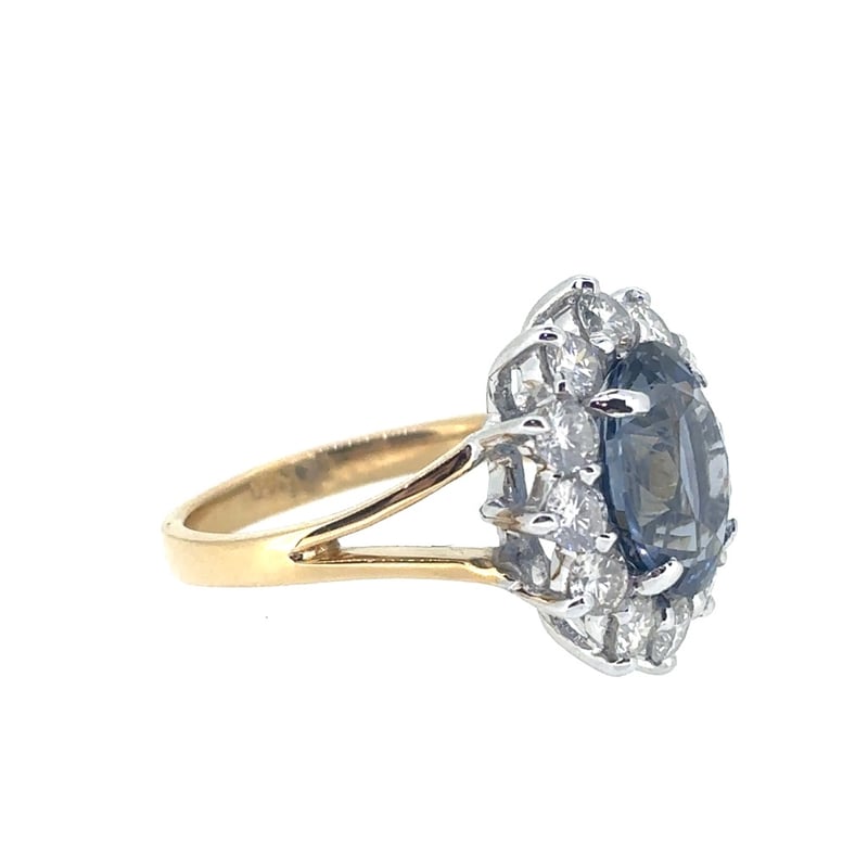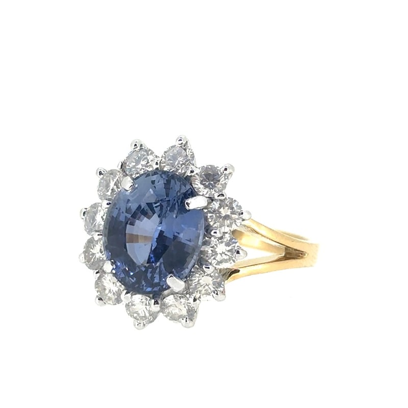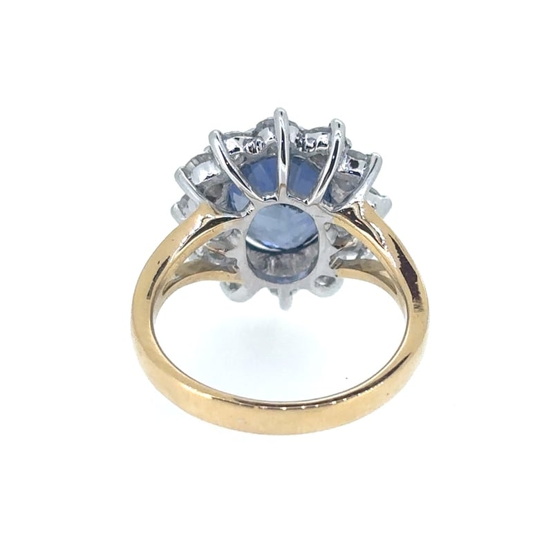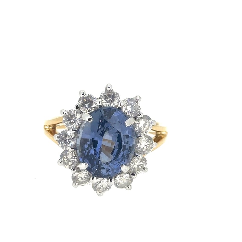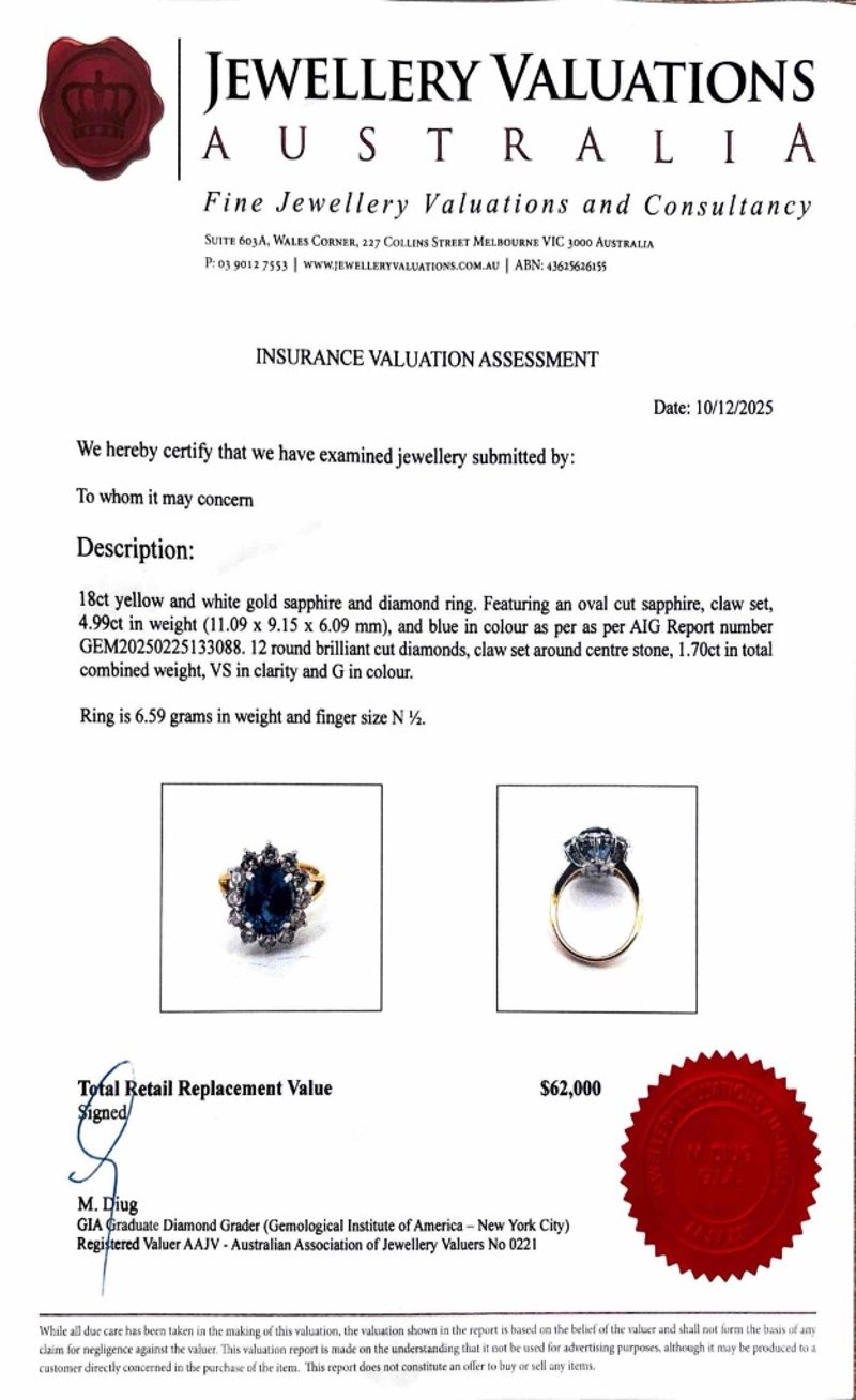 18CT YELLOW AND WHITE GOLD SAPPHIRE AND DIAMOND RINGFeaturing An Oval Cut Sapphire, Claw Set, 4.99Ct In Weight (11.09 X 9.15 X 6.09 Mm), And Blue In Colour As Per As Per Aig Report Number Gem20250225133088. 12 Round Brilliant Cut Diamonds, Claw Set Around Centre Stone, 1.70Ct In Total Combined Weight, Vs In Clarity And G In Colour. Finger Size N 1/2Total Item Weight: 6.59gCondition: Good - Refer To ImagesThis valuation has been conducted by an independent third-party professional. The valuation amount is an assessment by the issuing valuer and does not reflect the auction value of the item.Any inquiries regarding the valuation should be directed to the issuing valuer (refer to contact details on the certificate), as Lloyds Auctions has no affiliation or influence over the valuation, the valuer, or the stated amount.Insurance Replacement Valuation Amount: $62,000.00CROSSDOCK163029+13