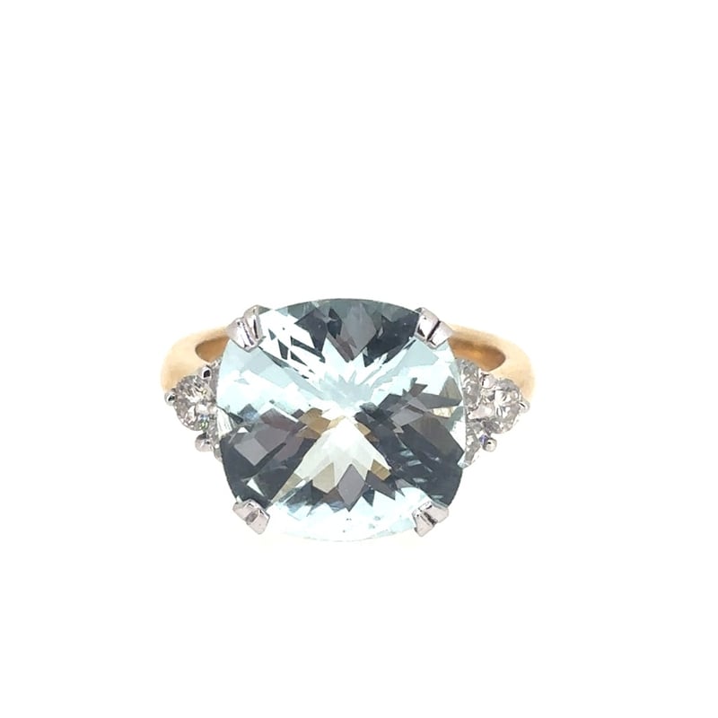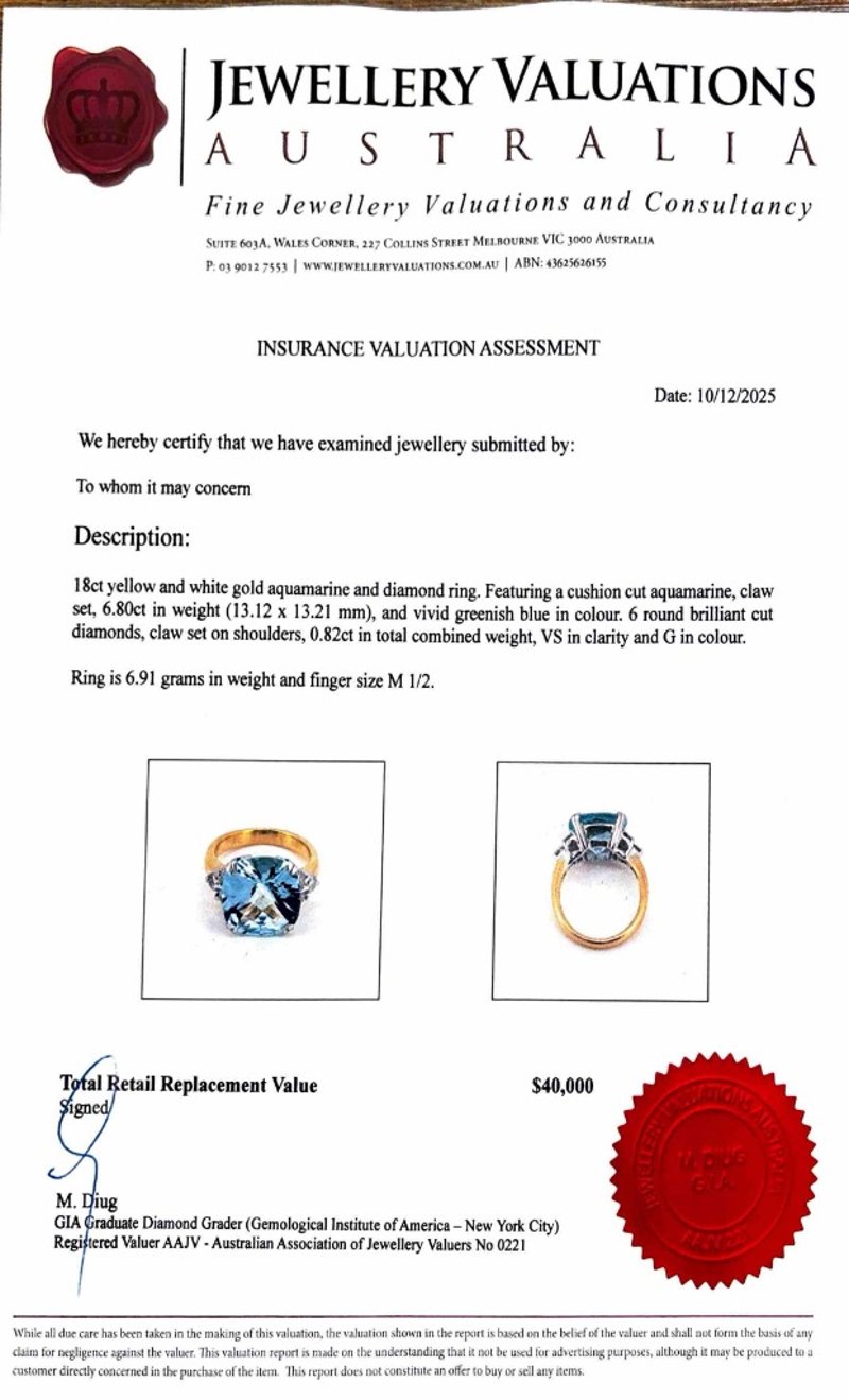 18CT YELLOW AND WHITE GOLD AQUAMARINE AND DIAMOND RINGFeaturing A Cushion Cut Aquamarine, Claw Set, 6.80Ct In Weight (13.12 X 13.21 Mm), And Vivid Greenish Blue In Colour. 6 Round Brilliant Cut Diamonds, Claw Set On Shoulders, 0.82Ct In Total Combined Weight, Vs In Clarity And G In Colour. Finger Size M 1/2.Total Item Weight: 6.91gCondition: Good - Refer To ImagesThis valuation has been conducted by an independent third-party professional. The valuation amount is an assessment by the issuing valuer and does not reflect the auction value of the item.Any inquiries regarding the valuation should be directed to the issuing valuer (refer to contact details on the certificate), as Lloyds Auctions has no affiliation or influence over the valuation, the valuer, or the stated amount.Insurance Replacement Valuation Amount: $40,000.00CROSSDOCK163029+18
