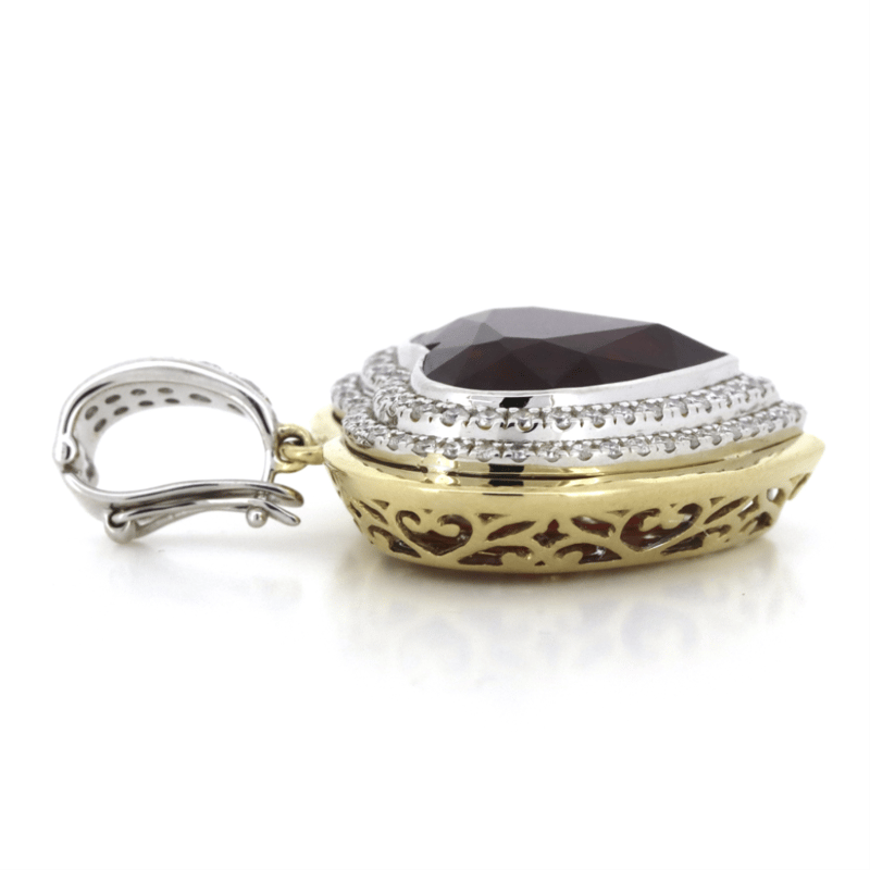 The Centre Features, Heart Cut, Medium-Dark Red, Rubellite (15.54Ct, Light-Moderate Inclusions), Bezel Set. Surrounding The Centre In A Double Halo And Decorating The Bail Are, 92 Round Brilliant Cut, Diamonds (1.10Ct Tdw, H-J Colour, Si-I2 Clarity), Bead Set. The Pendant Features A Figure Eight Safety Clip Attached. Total Item Weight Is 20Grams.