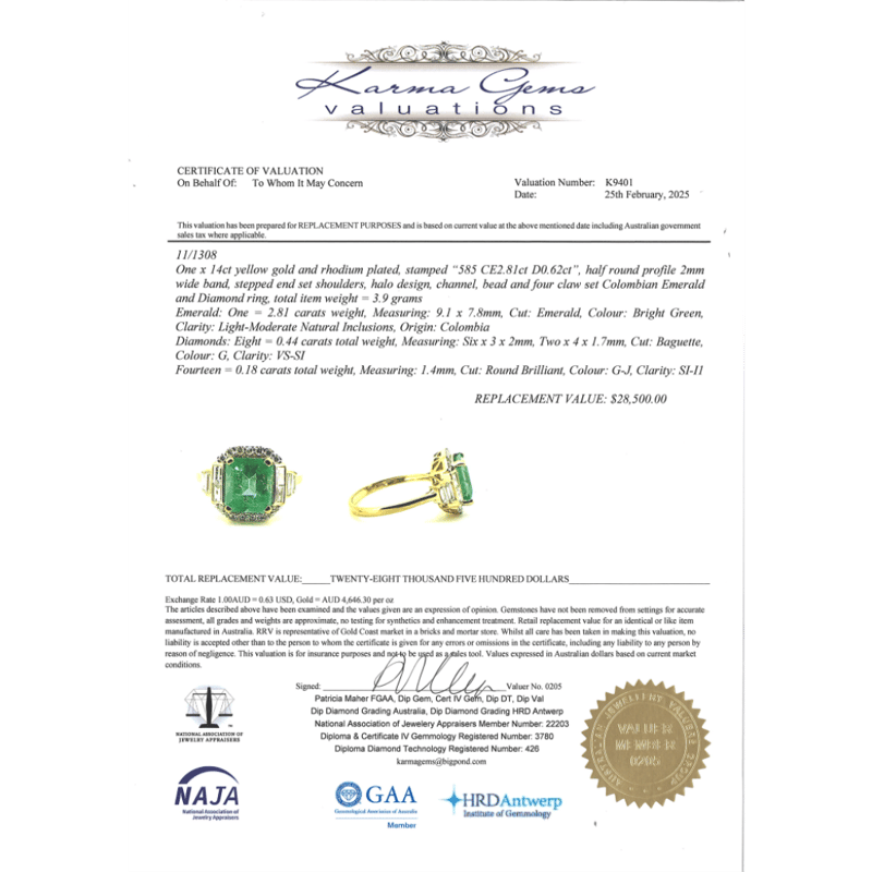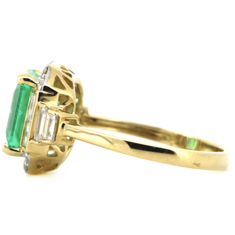 The Centre Features, One Emerald Cut, Bright Green, Colombian Emerald (2.81Ct, Light-Moderate Natural Inclusions), 4 Claw Set. Supporting The Centre Are, 8 Baguette Cut, Diamond (0.44Ct Tdw, G Colour, Vs-Si Clarity), Channel Set. Encompassing The Centre Are, 14 Round Brilliant Cut, Diamonds (0.18Ct Tdw, G-J Colour, Si-I1 Clarity), Bead Set In White Gold. Ring Size O.
