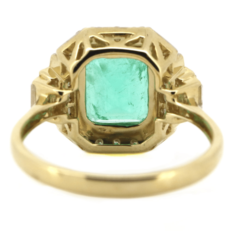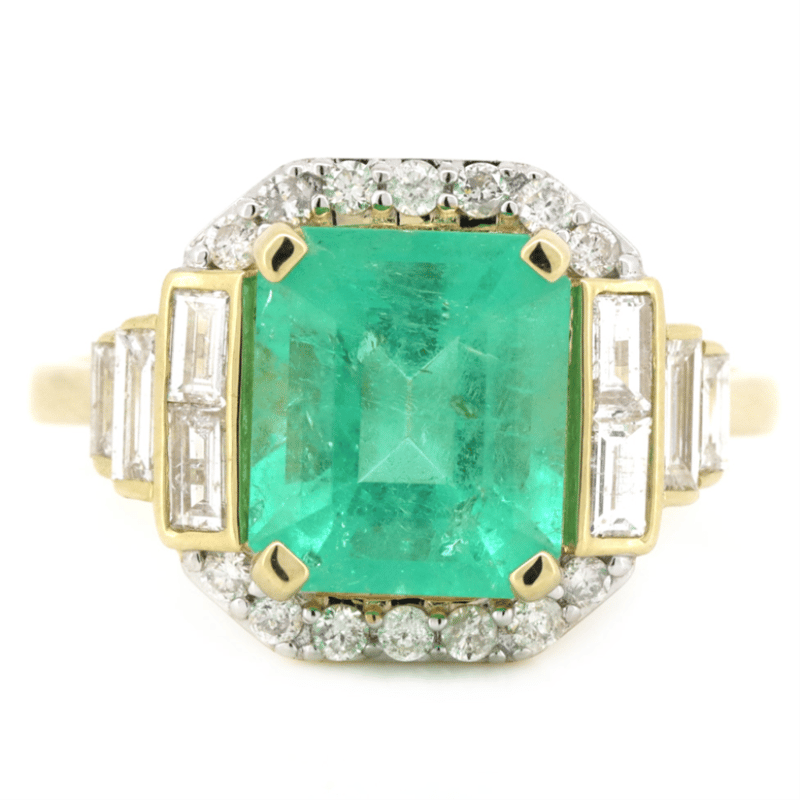 14K YELLOW GOLD, 2.81CT COLOMBIAN EMERALD AND DIAMOND, ART DECO INSPIRED RING.