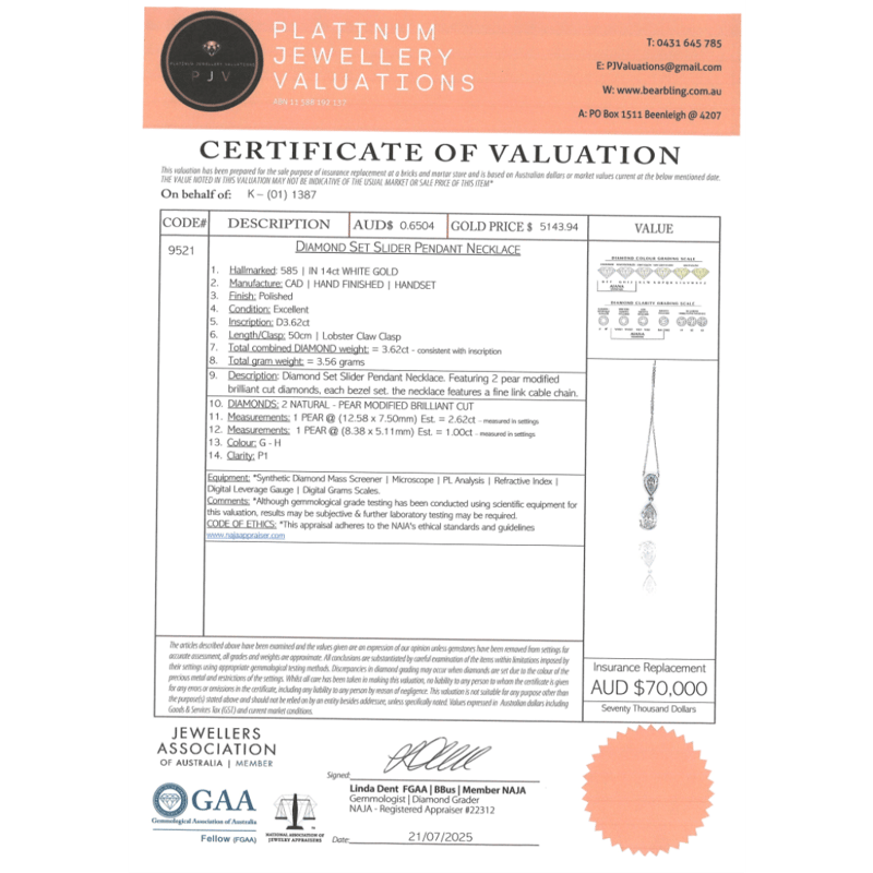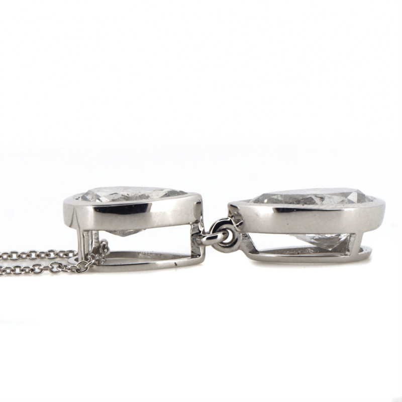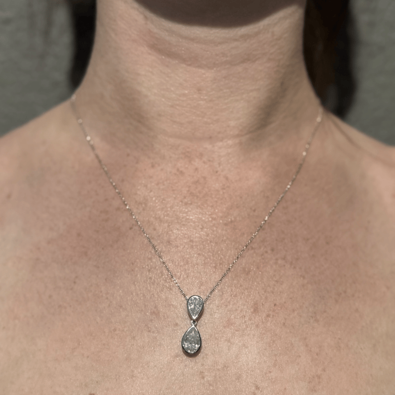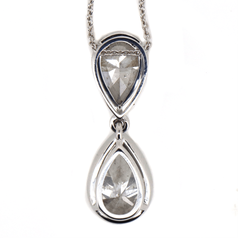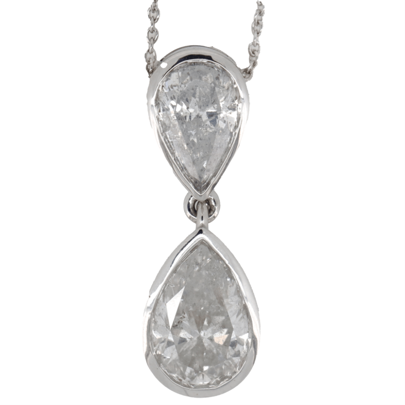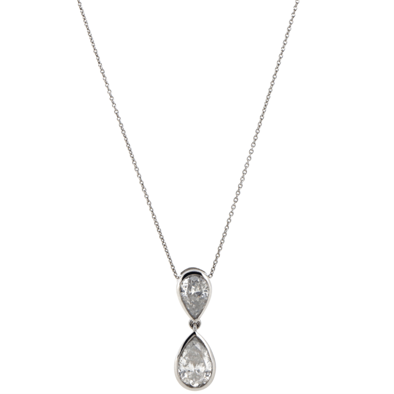The Necklace Features, One Pear Modified Brilliant Cut, Diamond (2.62Ct, G-H Colour, P1 Clarity), Bezel Set. In Addition, The Necklace Features One Pear Faceted Cut, Diamond (1.00Ct, G-H Colour, P1 Clarity), Bezel Set. The Necklace Features A Fine Link Cable Chain And Features A Lobster Clasp. The Necklace Is 50Cm.