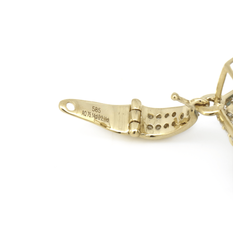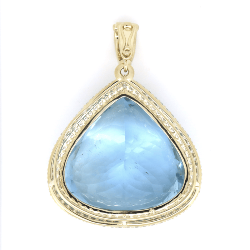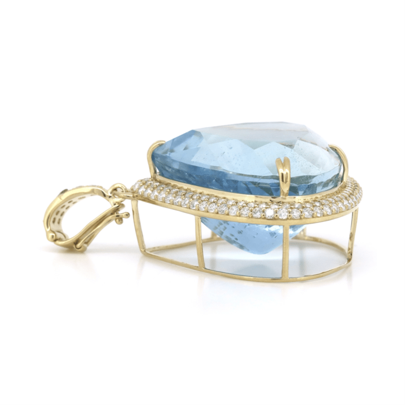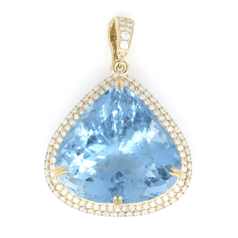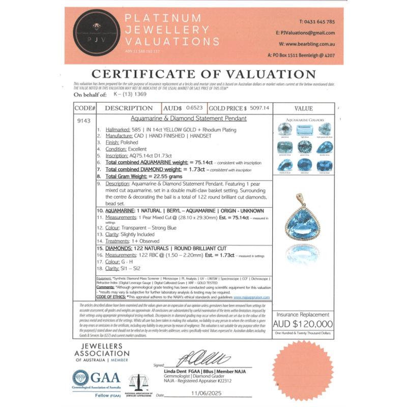 14K YELLOW GOLD, 75.14CT AQUAMARINE AND DIAMOND, STATEMENT PENDANT. The Centre Features, One Pear Mixed Cut, Strong Blue, Aquamarine (75.14Ct, Slightly Included), Multi-Claw Basket Set. Surrounding The Centre In A Double Halo And Decorating The Bail Are, 122 Round Brilliant Cut, Diamonds (1.73Ct Tdw, G-H Colour, Si1-Si2 Clarity), Bead Set. Total Item Weight Is 22.55Grams. Valuations Provided by an Independent Third-Party Professional Not Directly Associated With Lloyds Auctions at AUD $$120,000.00This valuation has been conducted by an independent third-party professional. The valuation amount is an assessment by the issuing valuer and does not reflect the auction value of the item. Any inquiries regarding the valuation should be directed to the issuing valuer (refer to contact details on the certificate), as Lloyds Auctions has no affiliation or influence over the valuation, the valuer, or the stated amount. Condition: Good - Refer Images 0645908+5208