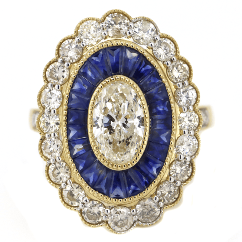 14K YELLOW GOLD, BLUE SAPPHIRE AND DIAMOND, ART DECO INSPIRED RING. The Centre Features, One Oval Modified Brilliant Cut, Diamond, (1.01Ct, J Colour, P2 Clarity), Bezel Set. Surrounded By, 24 Baguette Cut, Moderate Blue, Sapphires (1.06Ct Tsw, Moderately Included), Channel Set. Decorating The Design Are, 27 Round Brilliant Cut, Diamonds (1.42Ct Tdw, H-K Colour, P2 Clarity), Bead Set. Ring Size N 1/2. Valuations Provided by an Independent Third-Party Professional Not Directly Associated With Lloyds Auctions at AUD $$41,000.00This valuation has been conducted by an independent third-party professional. The valuation amount is an assessment by the issuing valuer and does not reflect the auction value of the item. Any inquiries regarding the valuation should be directed to the issuing valuer (refer to contact details on the certificate), as Lloyds Auctions has no affiliation or influence over the valuation, the valuer, or the stated amount. Condition: Good - Refer Images 0645908+5246