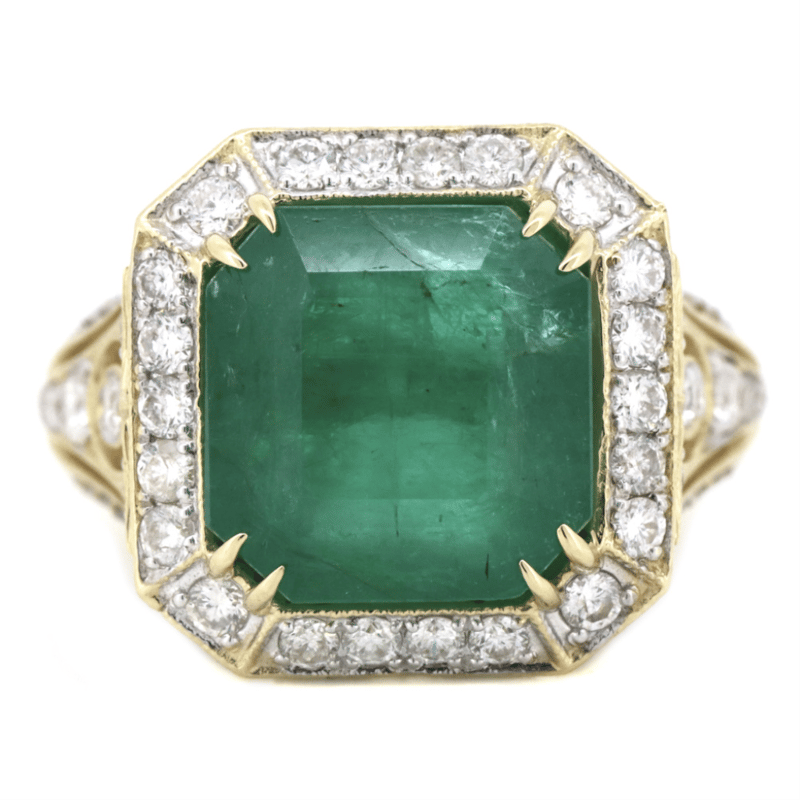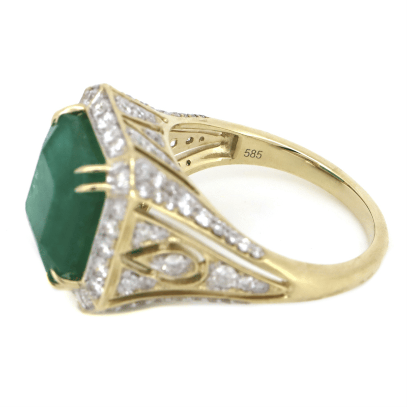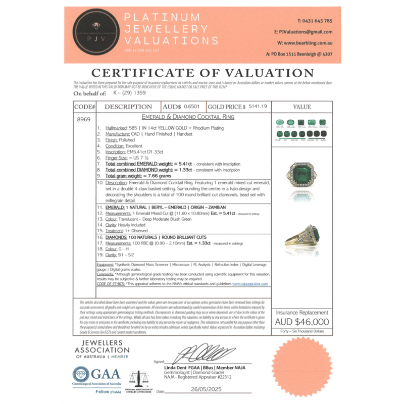 14K YELLOW GOLD, 5.41CT ZAMBIAN EMERALD AND DIAMOND, COCKTAIL RING. The Centre Features, One Emerald Mixed Cut, Deep Moderate Bluish-Green, Zambian Emerald (5.41Ct, Heavily Included), Double 4 Claw Set. Surrounding The Centre In A Halo And Decorating The Shoulders Are, 100 Round Brilliant Cut, Diamonds (1.33Ct Tdw, G-H Colour, Si1-Si2 Clarity), Bead Set In White Gold With Millegrain Detail. Ring Size O 1/2. Valuations Provided by an Independent Third-Party Professional Not Directly Associated With Lloyds Auctions at AUD $$46,000.00This valuation has been conducted by an independent third-party professional. The valuation amount is an assessment by the issuing valuer and does not reflect the auction value of the item. Any inquiries regarding the valuation should be directed to the issuing valuer (refer to contact details on the certificate), as Lloyds Auctions has no affiliation or influence over the valuation, the valuer, or the stated amount. Condition: Good - Refer Images 0645908+5245