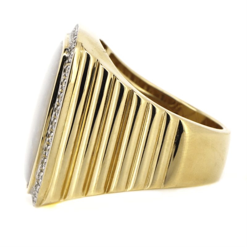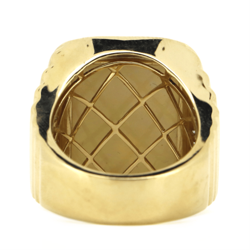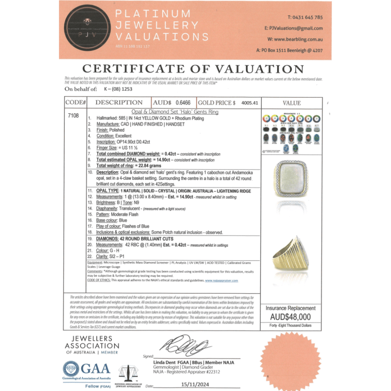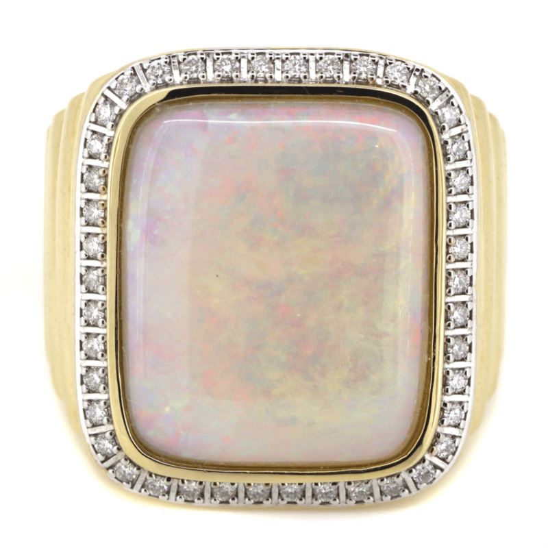 14K YELLOW GOLD, 14.90CT ANDAMOOKA OPAL AND DIAMOND, HALO GENTS RING.