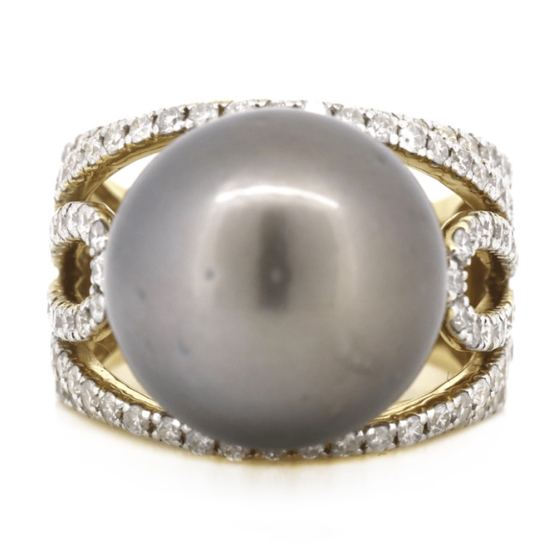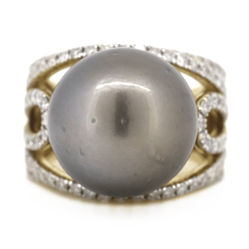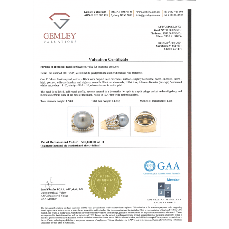14K YELLOW/WHITE GOLD, BLACK CULTURED TAHITIAN PEARL AND DIAMOND, COCKTAIL RING. The Centre Features, One Round, Black With Green/Purple Overtones, Cultured Tahitian Pearl (15.54Mm Size, Slightly Blemished, High Lustre). Embellishing The Design Are, 118 Round Brilliant Cut, Diamonds (1.58Ct Tdw, J-K Colour, Si2-I2 Clarity), Micro-Claw Set In White Gold. Ring Size O. Valuations Provided by an Independent Third-Party Professional Not Directly Associated With Lloyds Auctions at AUD $$18,690.00This valuation has been conducted by an independent third-party professional. The valuation amount is an assessment by the issuing valuer and does not reflect the auction value of the item. Any inquiries regarding the valuation should be directed to the issuing valuer (refer to contact details on the certificate), as Lloyds Auctions has no affiliation or influence over the valuation, the valuer, or the stated amount. Condition: Good - Refer Images 0645908+5231