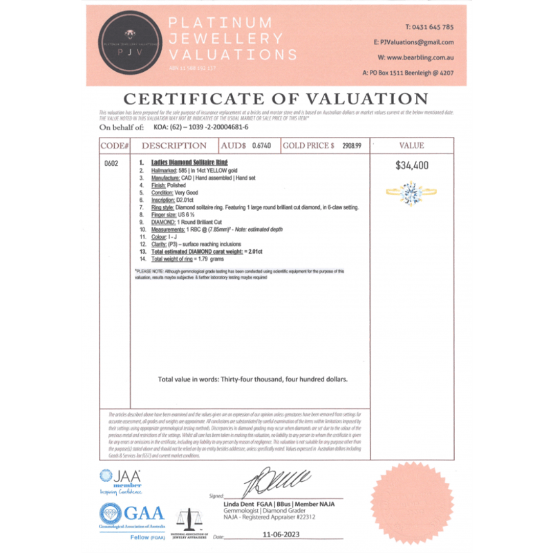 14K YELLOW GOLD, 2.01CT FANCY YELLOW DIAMOND, SOLITAIRE RING. The Centre Features, One Round Brilliant Cut, Light Fancy Yellow, Diamond (2.01Ct, P3 Clarity), 6 Claw Set. Ring Size M 1/2. Valuations Provided by an Independent Third-Party Professional Not Directly Associated With Lloyds Auctions at AUD $$34,400.00This valuation has been conducted by an independent third-party professional. The valuation amount is an assessment by the issuing valuer and does not reflect the auction value of the item. Any inquiries regarding the valuation should be directed to the issuing valuer (refer to contact details on the certificate), as Lloyds Auctions has no affiliation or influence over the valuation, the valuer, or the stated amount. Condition: Good - Refer Images 0645908+5215