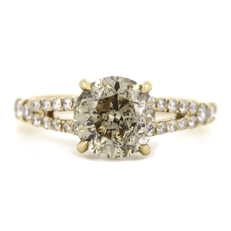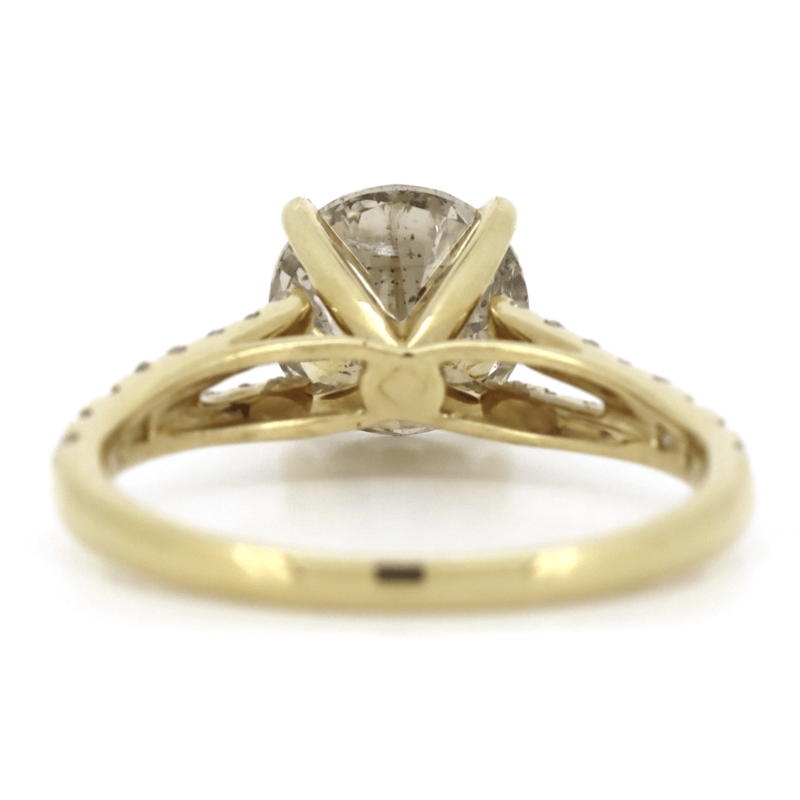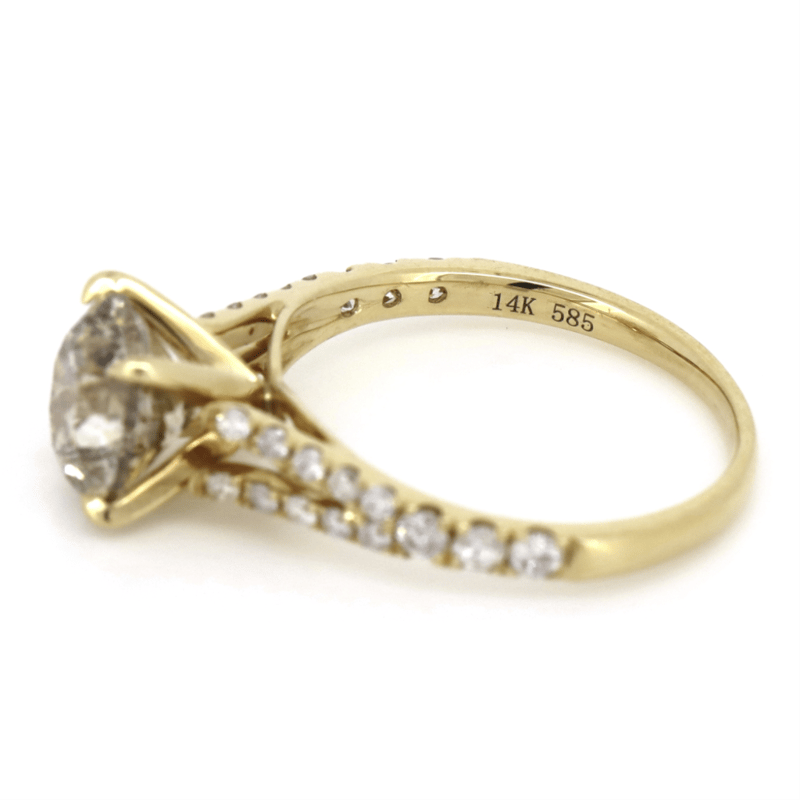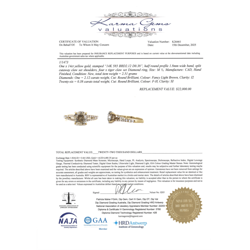 14K YELLOW GOLD AND DIAMOND, CLASSIC SPLIT BAND RING. The Centre Features, One Round Brilliant Cut, Brownish Tinted, Diamond (2.12Ct, Colour, Clarity), 4 Claw Set. Decorating The Split Band Design Are, 26 Round Brilliant Cut, Diamonds (0.38Ct Tdw, Colour, Si Clarity), Claw Set. Ring Size M 1/2. Valuations Provided by an Independent Third-Party Professional Not Directly Associated With Lloyds Auctions at AUD $$22,000.00This valuation has been conducted by an independent third-party professional. The valuation amount is an assessment by the issuing valuer and does not reflect the auction value of the item. Any inquiries regarding the valuation should be directed to the issuing valuer (refer to contact details on the certificate), as Lloyds Auctions has no affiliation or influence over the valuation, the valuer, or the stated amount. Condition: Good - Refer Images 0645908+5227