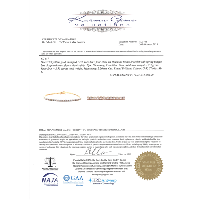 9K YELLOW GOLD, 2.55CT TDW DIAMOND, TENNIS BRACELET. The Design Features, 64 Round Brilliant Cut, Diamonds (2.55Ct Tdw, G-K Colour, Si-I2 Clarity), 4-Claw Set. The Bracelet Has A Box Clasp With Double Figure 8 Clasps. Bracelet Length Is 17Cm. Valuations Provided by an Independent Third-Party Professional Not Directly Associated With Lloyds Auctions at AUD $$32,500.00This valuation has been conducted by an independent third-party professional. The valuation amount is an assessment by the issuing valuer and does not reflect the auction value of the item. Any inquiries regarding the valuation should be directed to the issuing valuer (refer to contact details on the certificate), as Lloyds Auctions has no affiliation or influence over the valuation, the valuer, or the stated amount. Condition: Good - Refer Images 0645908+5218