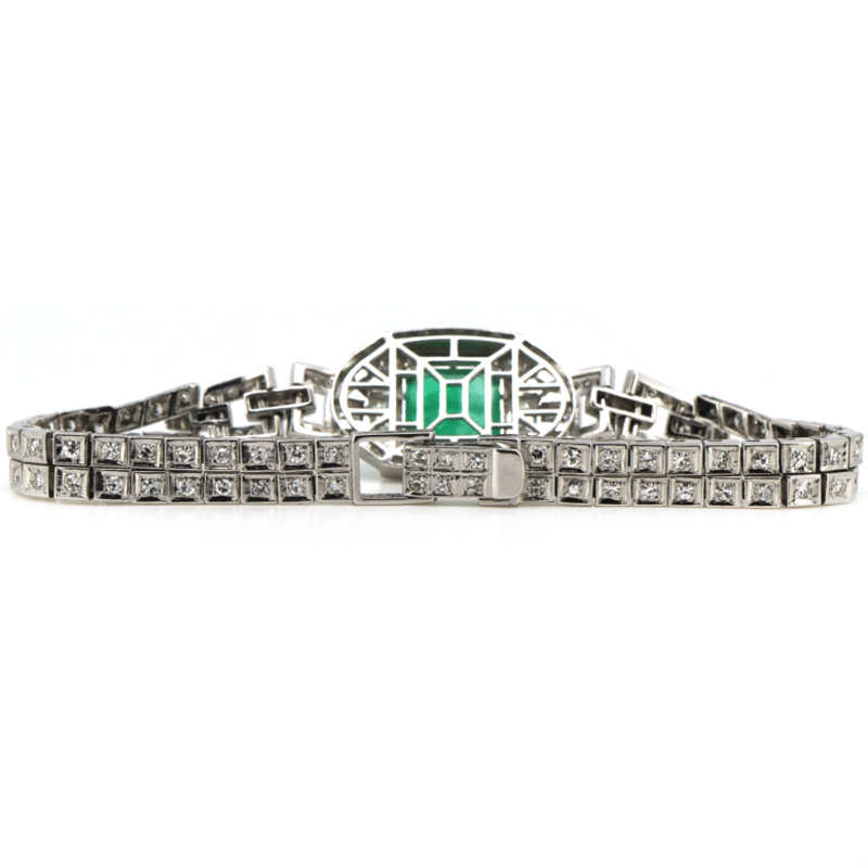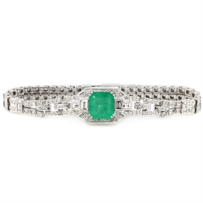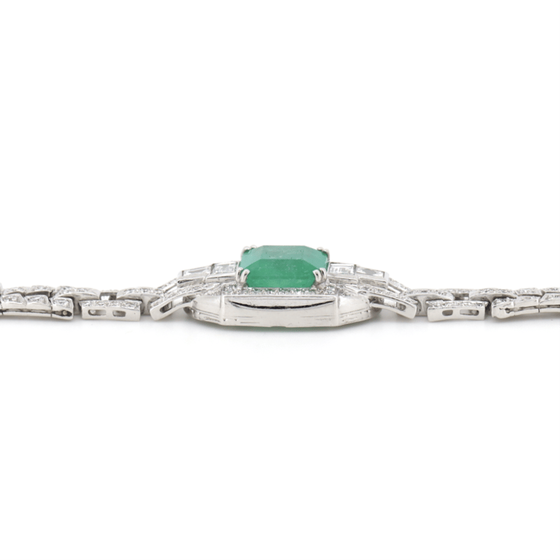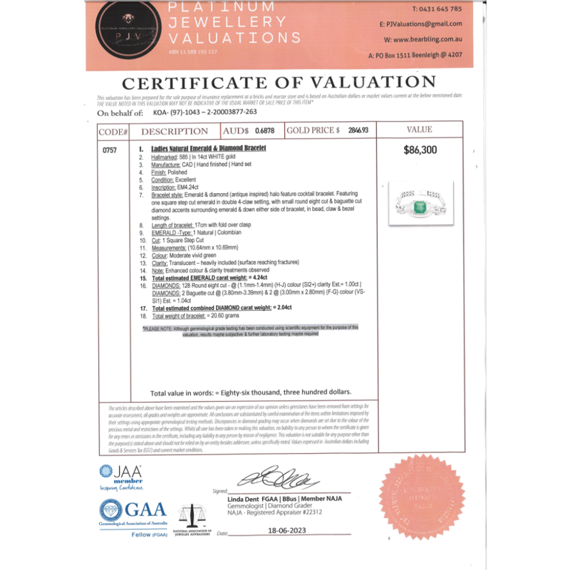 14K WHITE GOLD, 4.24CT COLOMBIAN EMERALD AND DIAMOND, BRACELET. The Centre Features, One Square Step Cut, Moderate Vivid Green (Colour Enhanced), Colombian Emerald (4.24Ct Heavily Included), Claw Set. Accompanying The Centre Are, 2 Baguette Cut, Diamonds (1.04Ct Tdw, F-G Colour, Vs-Si1 Clarity), Bead Set. Encompassing Them Are, 128 Round Brilliant Cut, Diamonds (1.00Ct Tdw, H-J Colour, Si2+), Claw Set. The Bracelet Features, A Fold Over Clasp And Is 17Cm. Valuations Provided by an Independent Third-Party Professional Not Directly Associated With Lloyds Auctions at AUD $$86,300.00This valuation has been conducted by an independent third-party professional. The valuation amount is an assessment by the issuing valuer and does not reflect the auction value of the item. Any inquiries regarding the valuation should be directed to the issuing valuer (refer to contact details on the certificate), as Lloyds Auctions has no affiliation or influence over the valuation, the valuer, or the stated amount. Condition: Good - Refer Images 0645908+5228