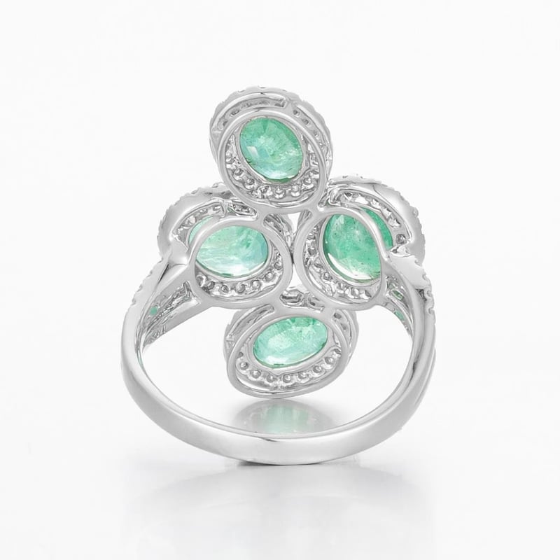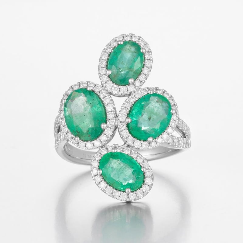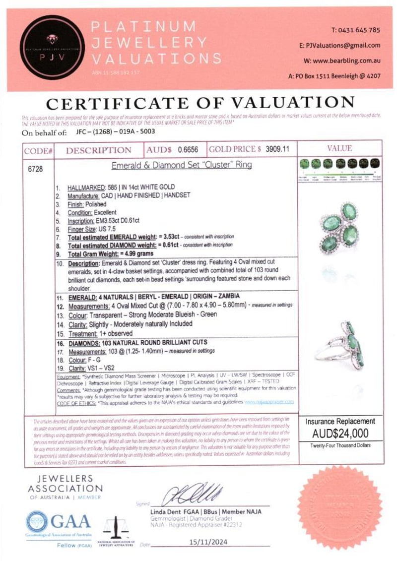 14CT WHITE GOLD ZAMBIAN EMERALD AND DIAMOND CLUSTER RING Featuring Centre, 4 Oval Cut, Strong Moderate Bluish Green Zambian Emeralds (3.53Ct Tsw, Slightly-Moderately Naturally Included), Claw Set, With 103 Round Brilliant Cut Diamonds (0.61Ct Tdw, F-G Colour, Vs1-Vs2 Clarity), Bead Set. Ring Size O. Valuations Provided by an Independent Third-Party Professional Not Directly Associated With Lloyds Auctions at AUD $24000This valuation has been conducted by an independent third-party professional. The valuation amount is an assessment by the issuing valuer and does not reflect the auction value of the item. Any inquiries regarding the valuation should be directed to the issuing valuer (refer to contact details on the certificate), as Lloyds Auctions has no affiliation or influence over the valuation, the valuer, or the stated amount. Condition: Good - Refer Images 0586328+607