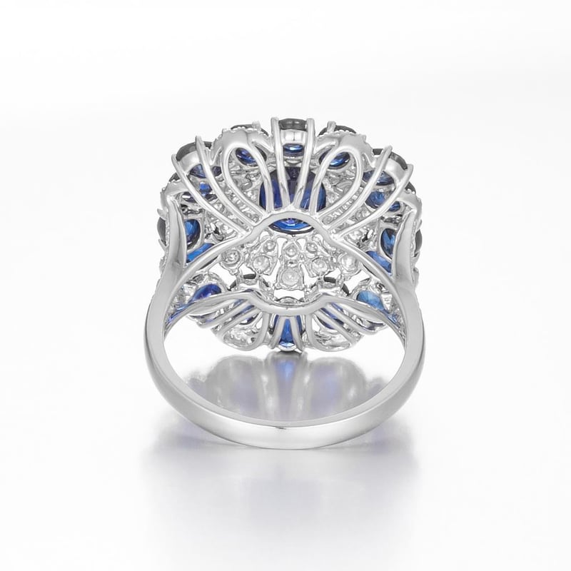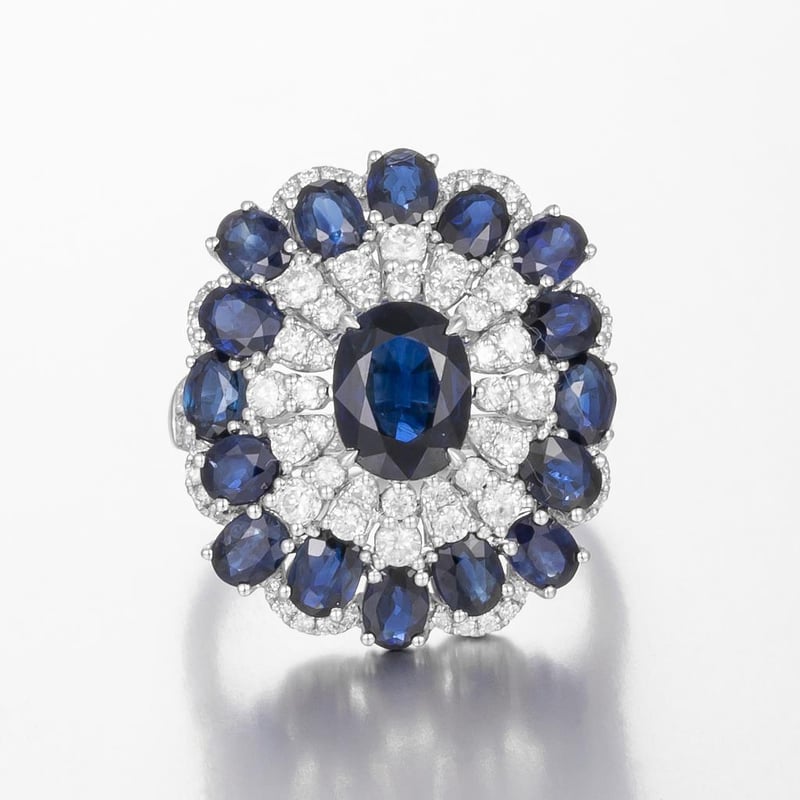 Featuring Centre, One Oval Cut, Dark Royal Blue Australian Sapphire (1.58Ct, Minor Inclusions), Claw Set, With 16 Oval Cut, Dark Royal Blue, Australian Sapphires (4.24Ct Tsw, Minor Inclusions), Claw Set, And 92 Round Brilliant Cut Diamonds (0.97Ct Tdw, G-H Colour, Si1-Si2 Clarity) Bead Set. Ring Size O.