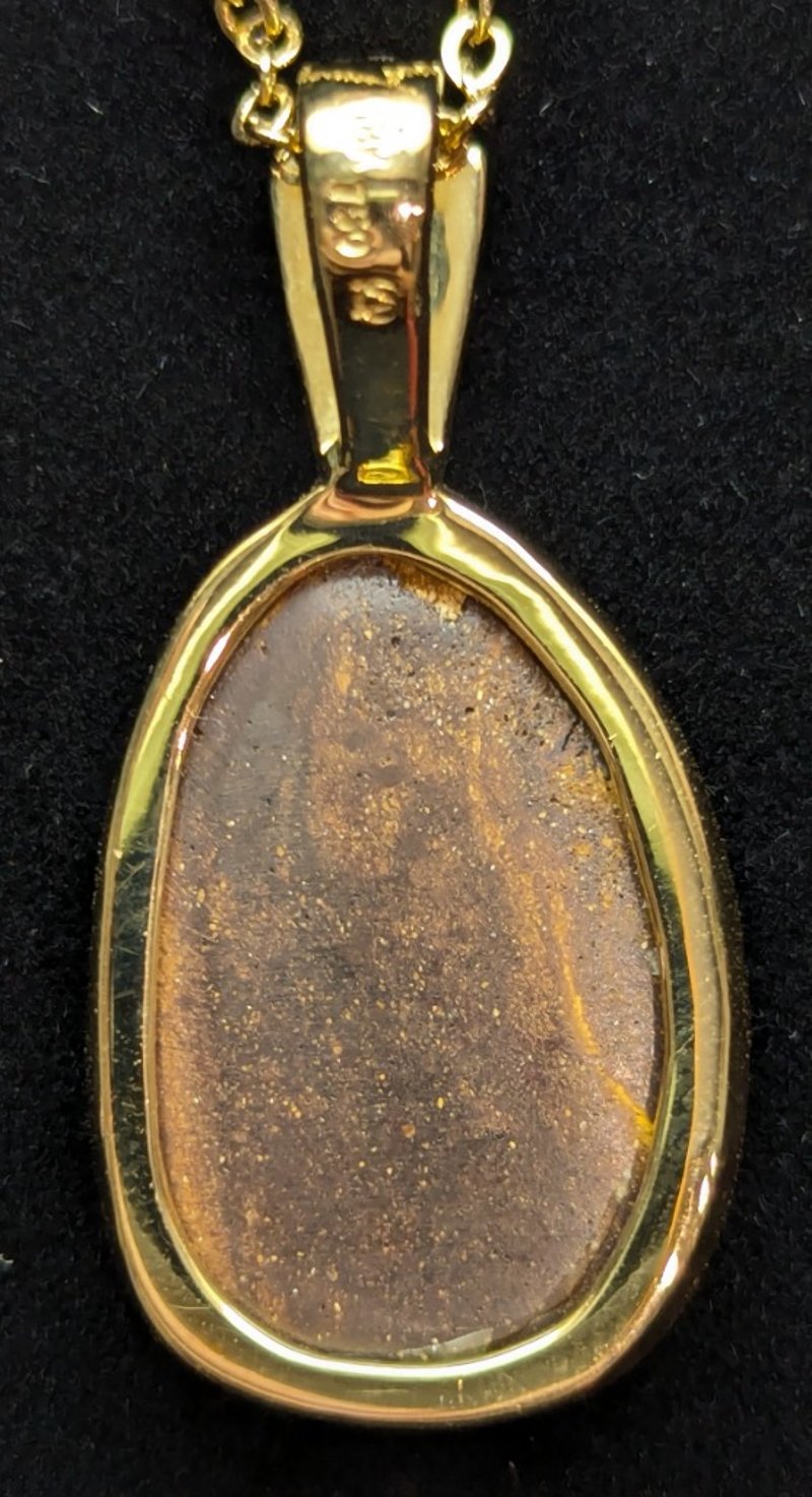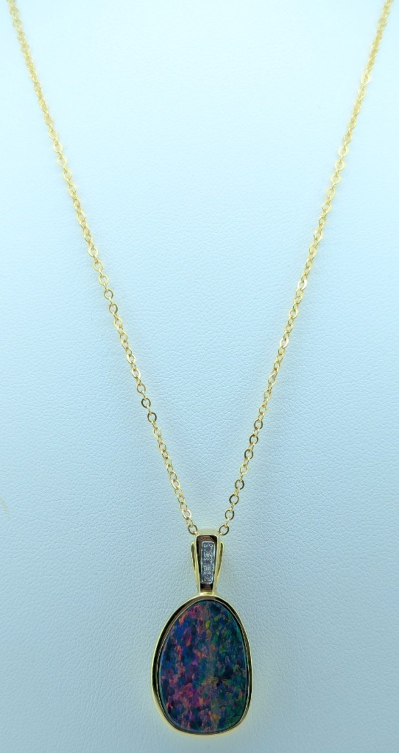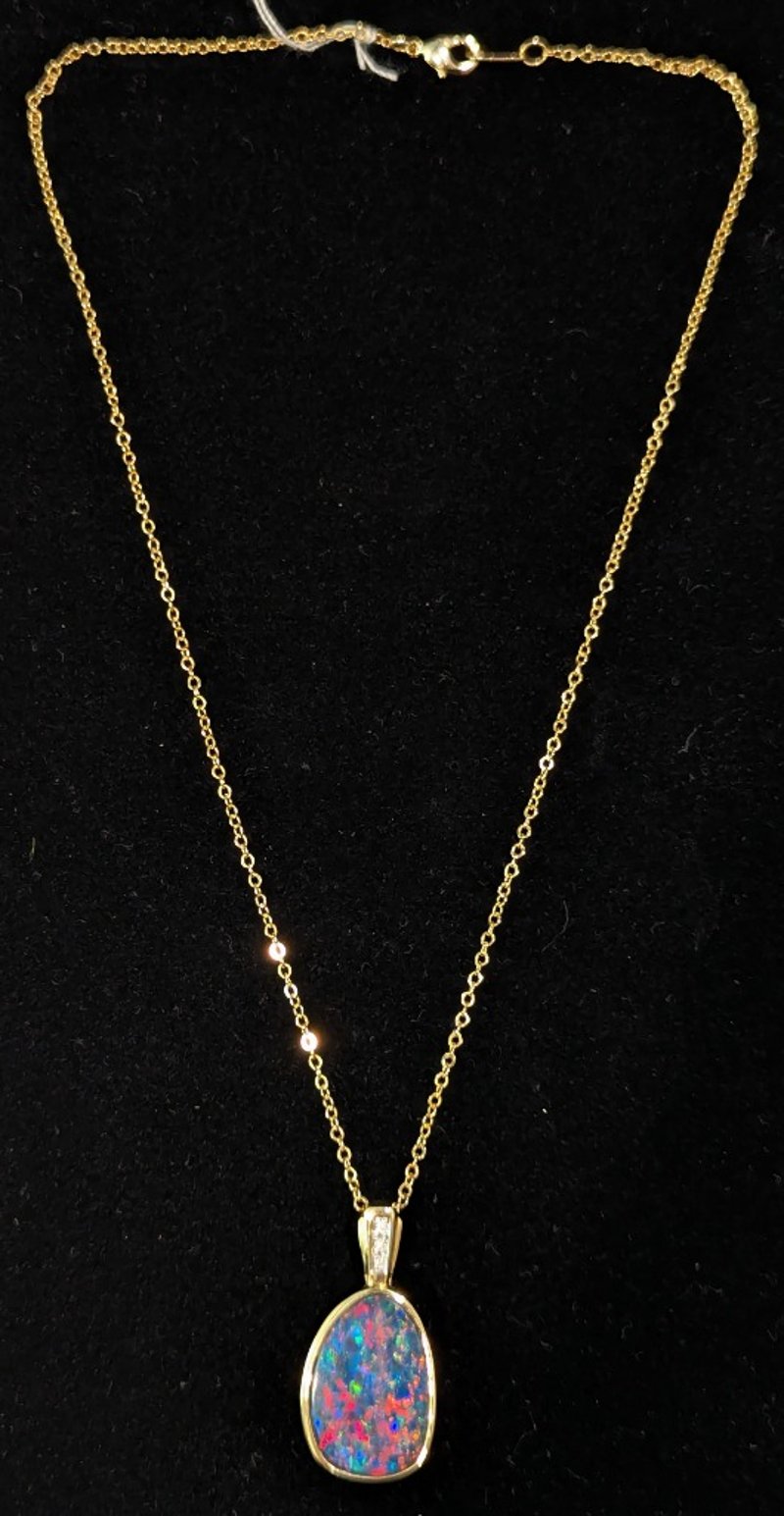 18K YELLOW GOLD OPAL AND DIAMOND PENDANT NECKLACE Necklace Features 7.55Ct Opal Doublet, Three 0.03 Tcw Round Round Cut Diamonds Set In Line Above Opal, Pendant Size Approx: 3.5Cm X 1.8Cm, Yellow Gold Plated Chain, Chain Length Approx: 40Cm (Unclasped) Total Item Weight: 8.05g Markings: Stamped: 750 / 18K Condition: Good - Refer To Images 586318+2