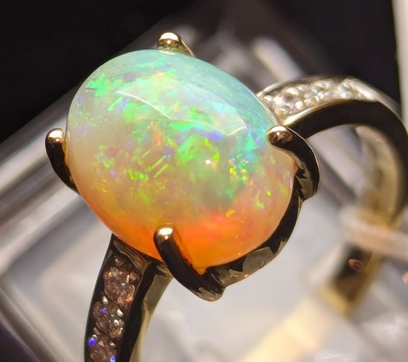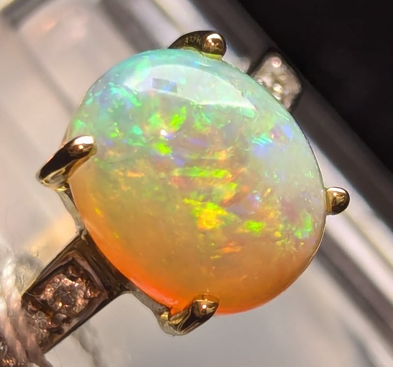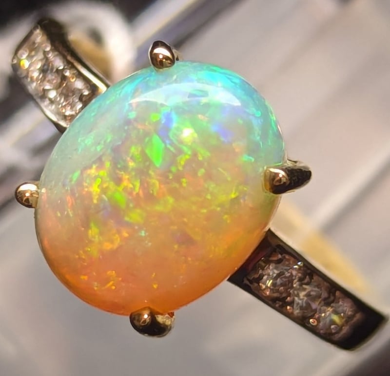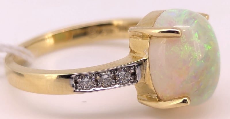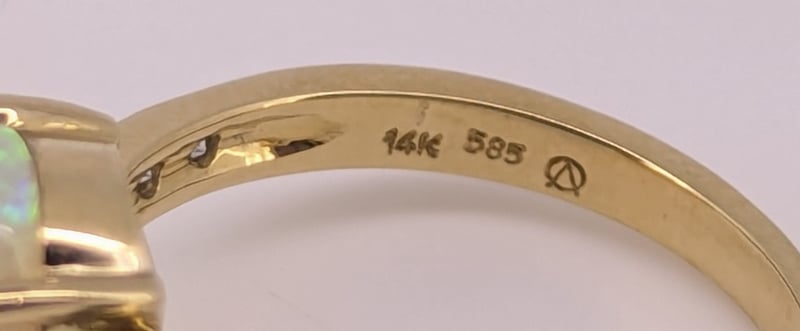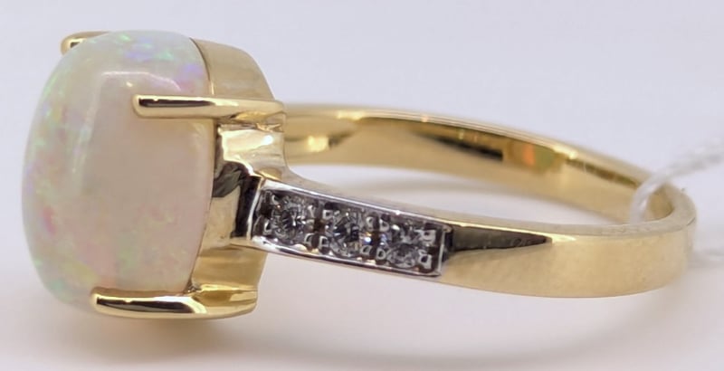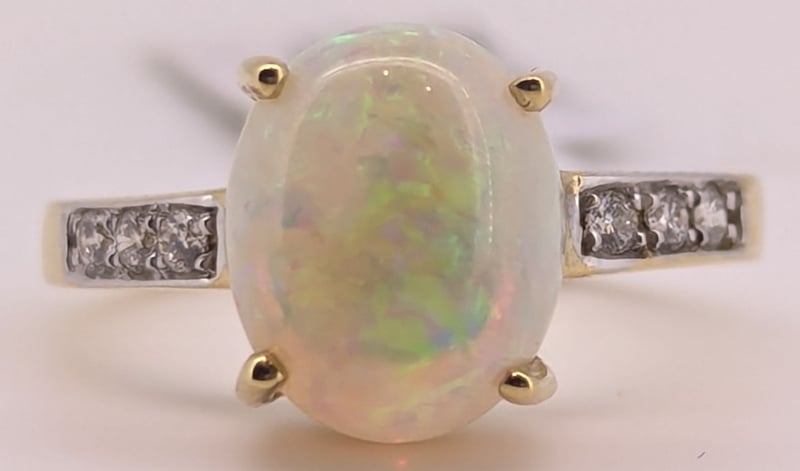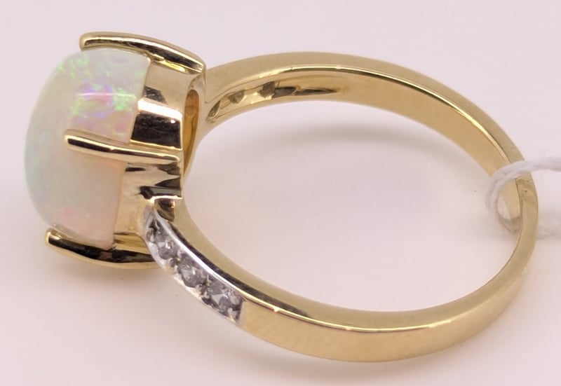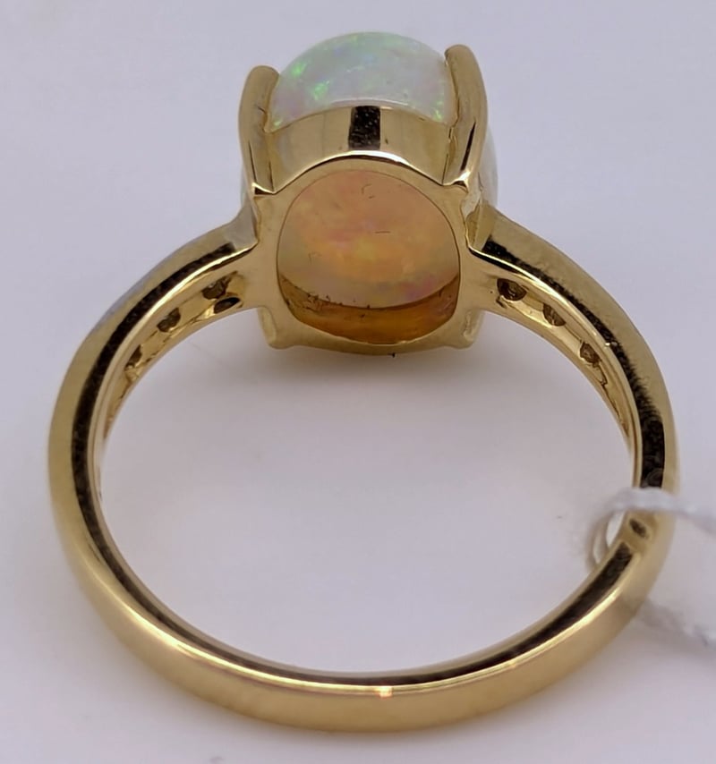 14K YELLOW GOLD OPAL AND DIAMOND RINGRing Features 3.63Ct Oval Cut Opal In Centre Four Claw Setting,Six Round Cut Diamonds In Ring Shoulder Settings, Total Diamond Weight: 0.13Ct,Ring Size: NTotal Item Weight: 3.65gMarkings: Stamped: 14K / 585586318+39