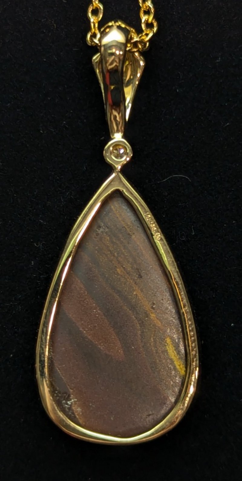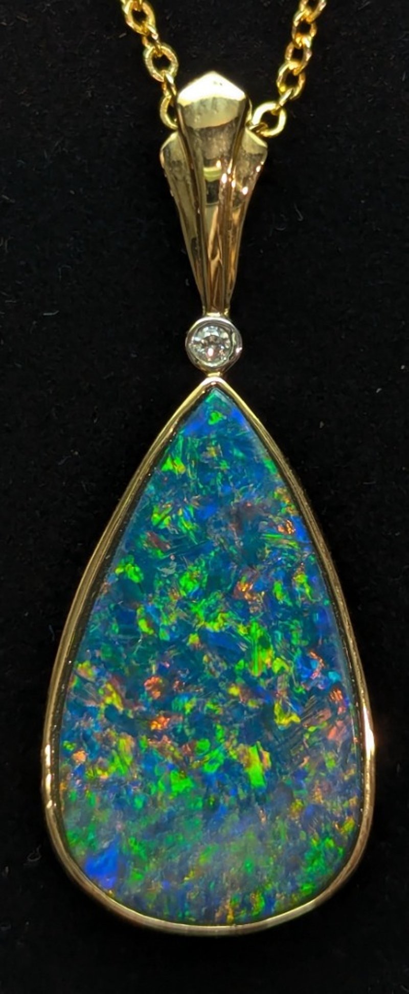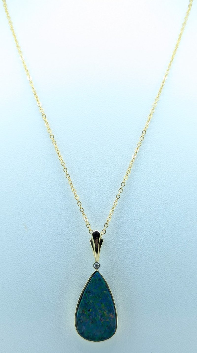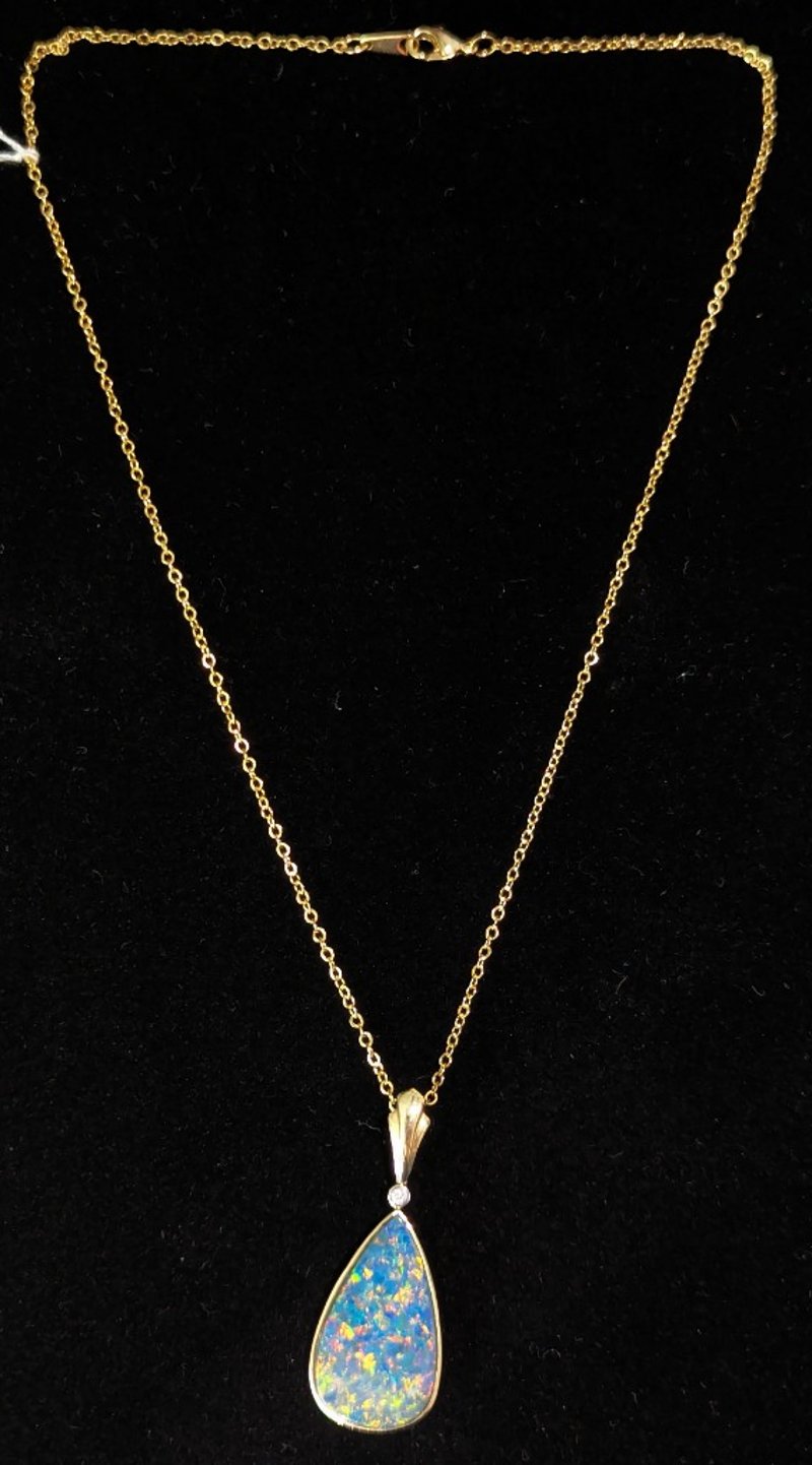 14K YELLOW GOLD OPAL AND DIAMOND PENDANT NECKLACE Pendant Features 5.49Ct Opal Doublet, One 0.02Ct Round Cut Diamond Set Above Opal, Pendant Size Approx: 4.3Cm X 2Cm, Yellow Gold Plated Chain, Chain Length Approx: 40Cm (Unclasped) Total Item Weight: 6.28g Markings: Stamped: 14K585 Condition: Good - Refer To Images 586318+3