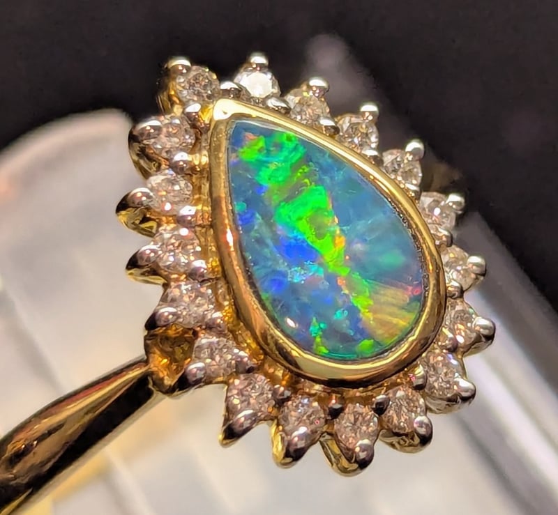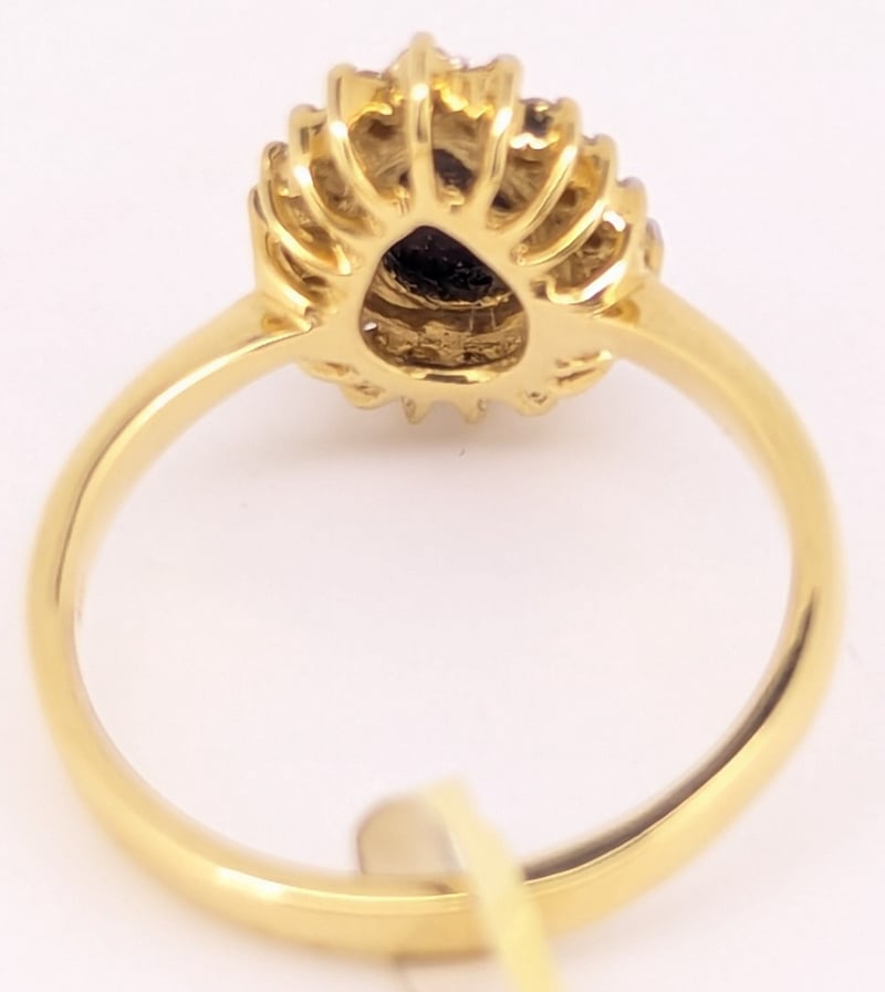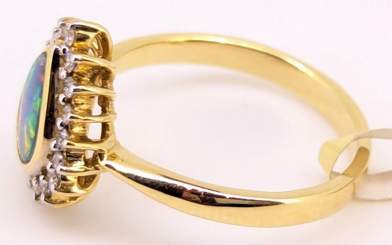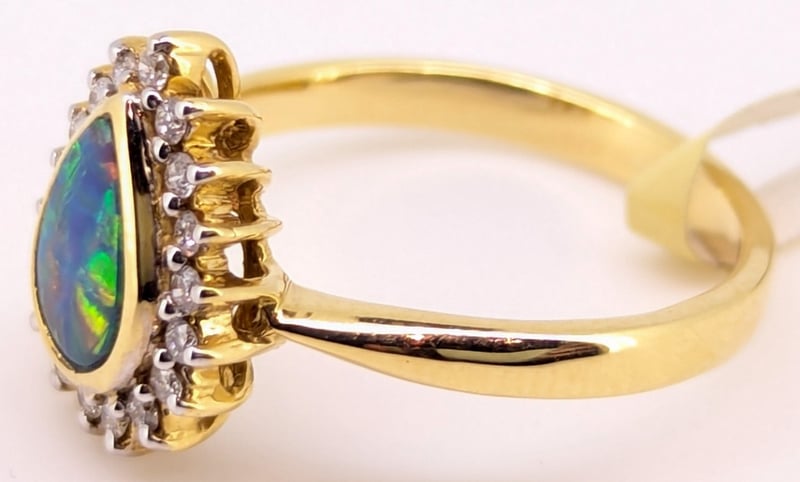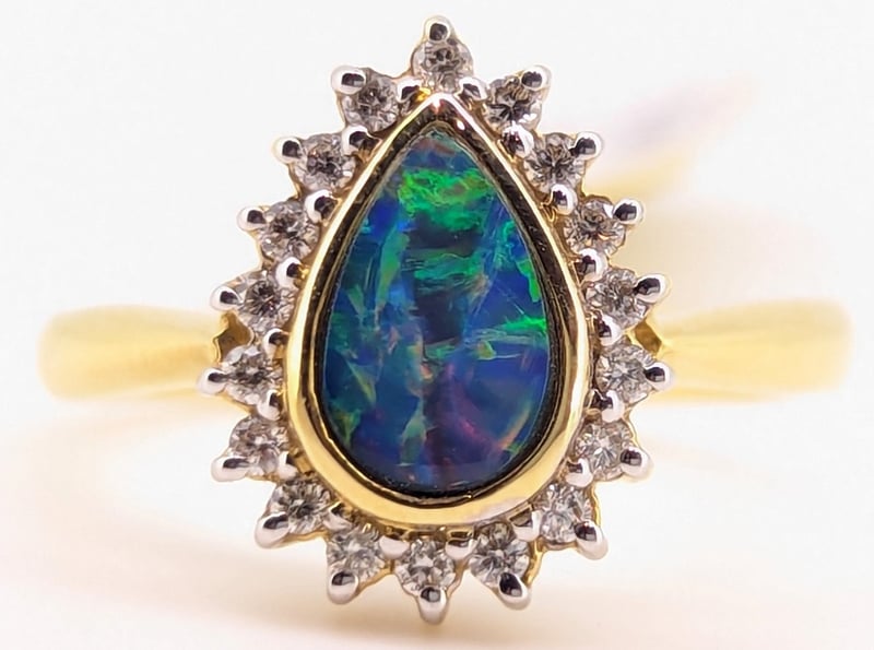 18K YELLOW GOLD OPAL AND DIAMOND RINGRing Features 0.49Ct Pear Cut Opal Doublet In Centre Setting,Eighteen Round Cut Diamonds Halo Set Around Centre, Total Diamond Weight: 0.18CtRing Size: NTotal Item Weight: 4.10gMarkings: Stamped: 18K / 750Condition: Good - Refer To Images586318+37