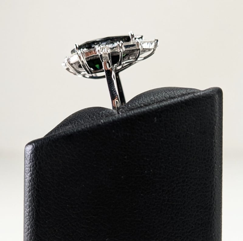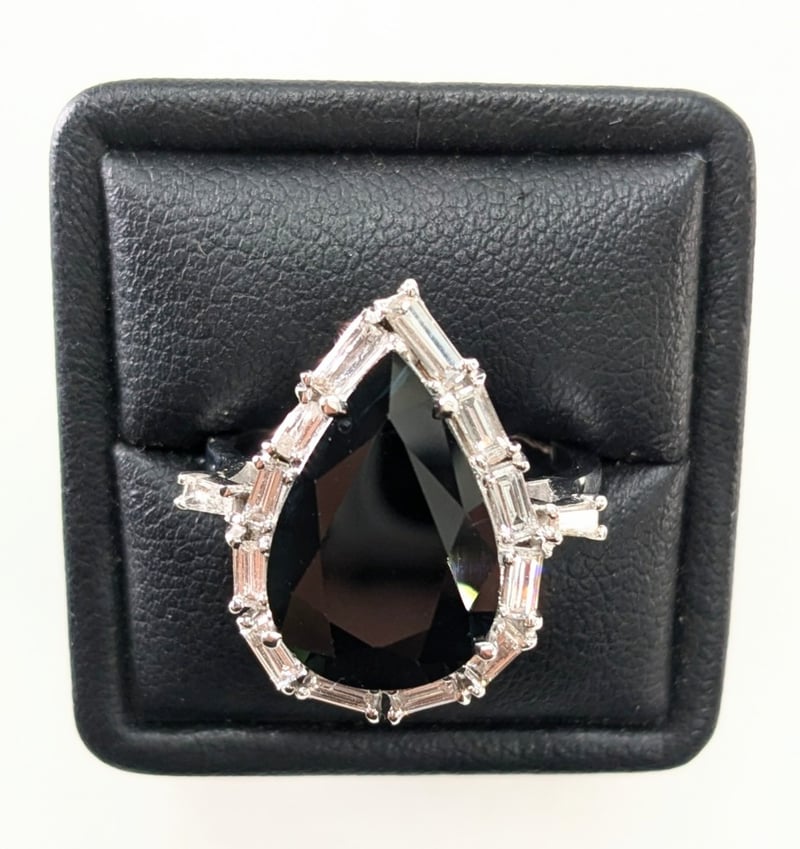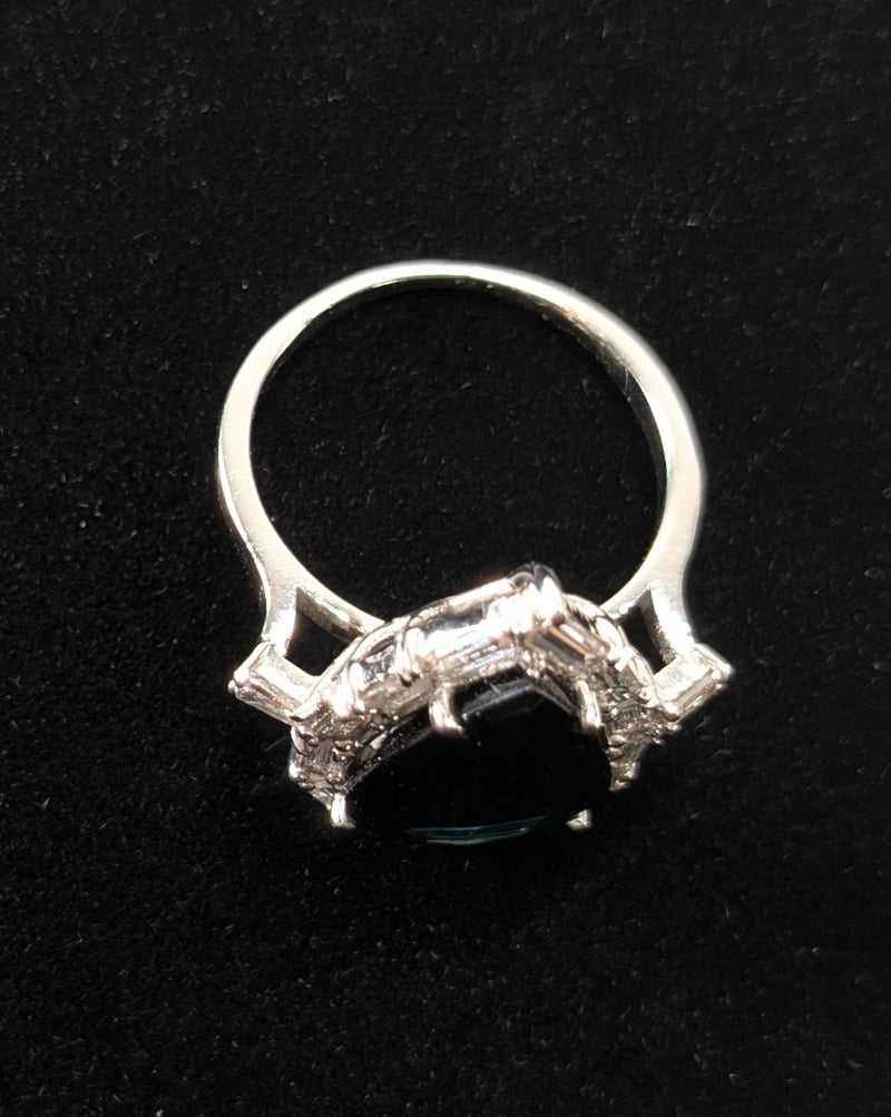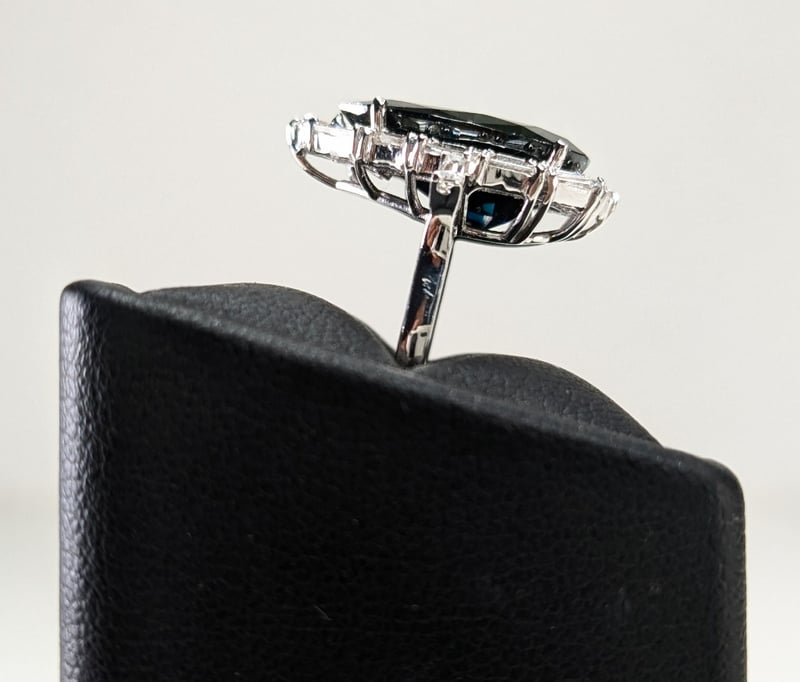 18Ct White Gold. Size L 1/2. Color & Clarity: G - H Si. Pear Faceted Blue Sapphire 6.40Ct. 14 Claw Set Baguette & Tapered Baguette Diamonds 0.60Ct.