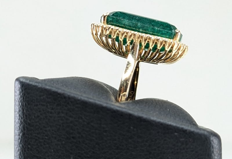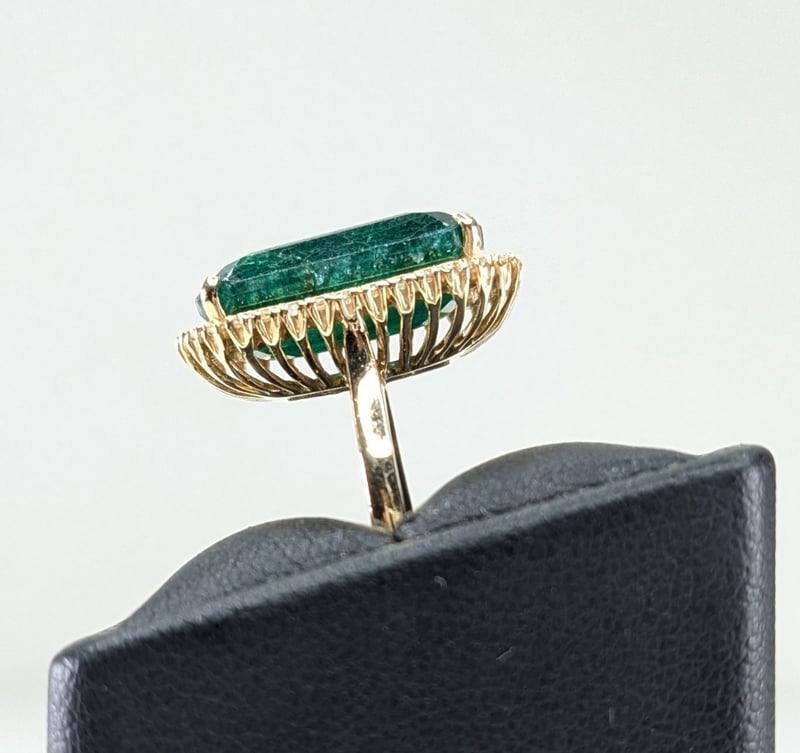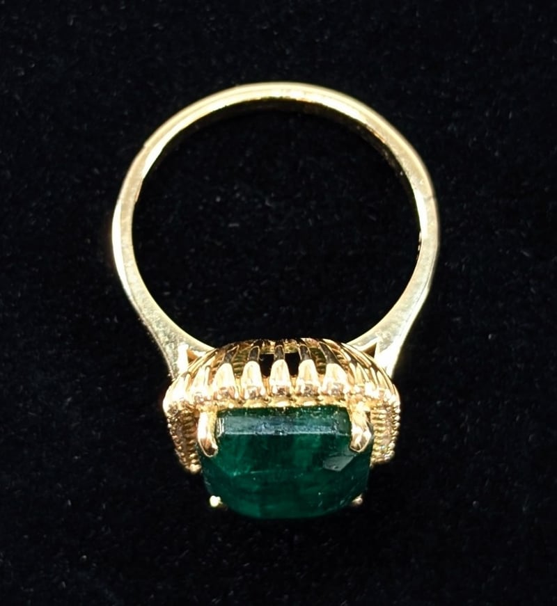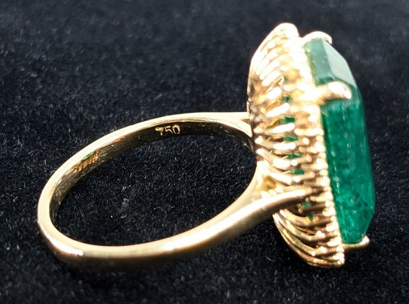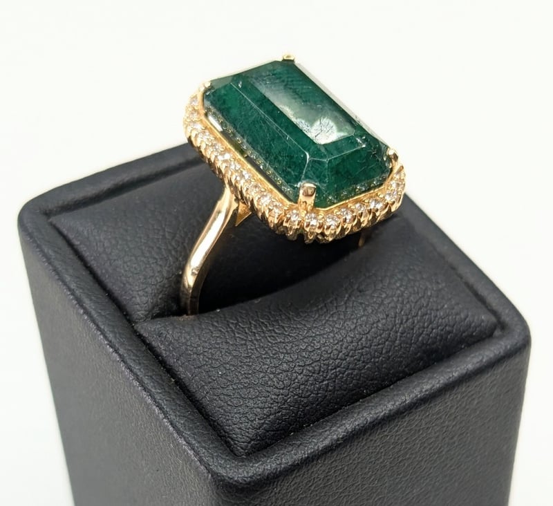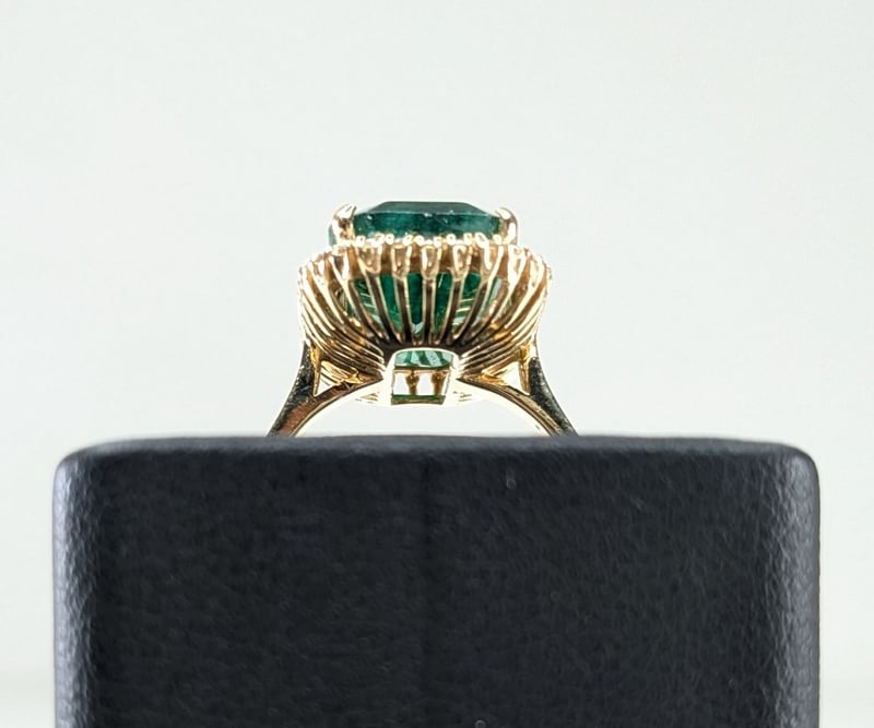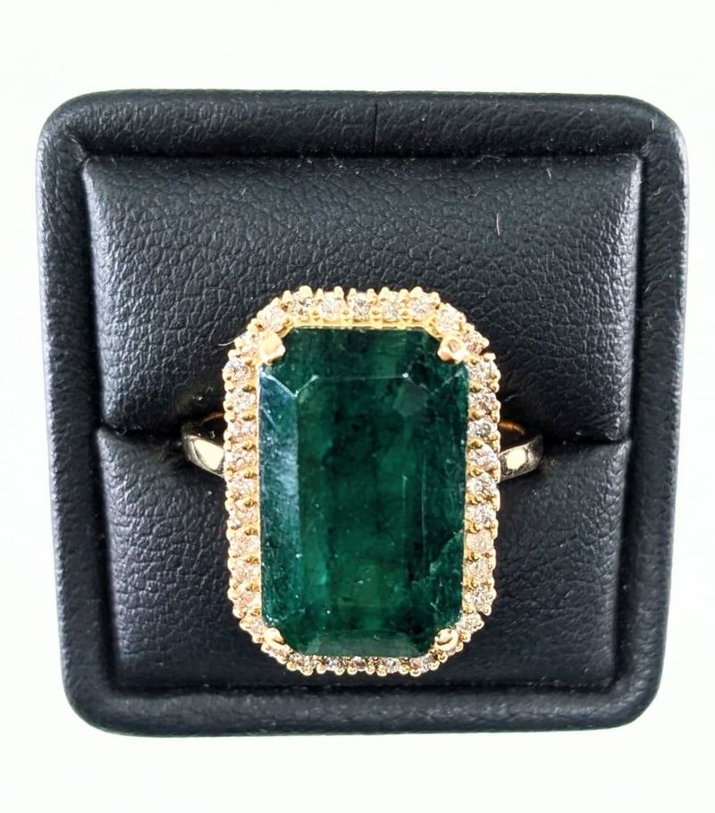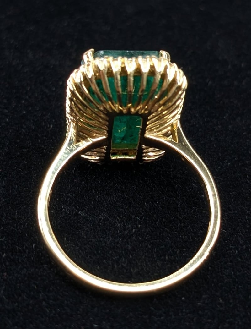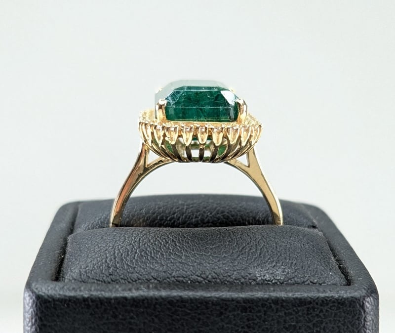 Size N. 18Ct Yellow Gold. Emerald Cut Emerald, Dark Green 11Ct. 36 Claw Set Round Brilliant Cut Diamonds, G-H S12, 0.36Ct.
