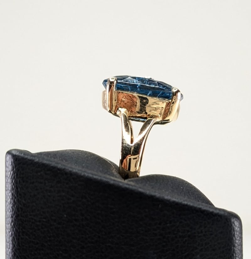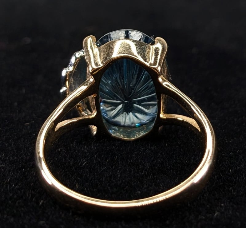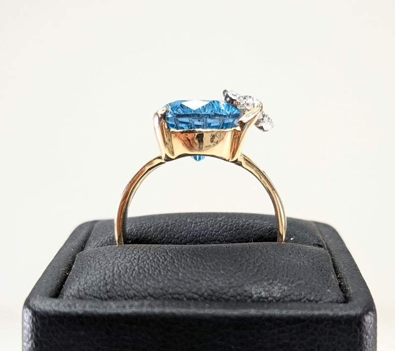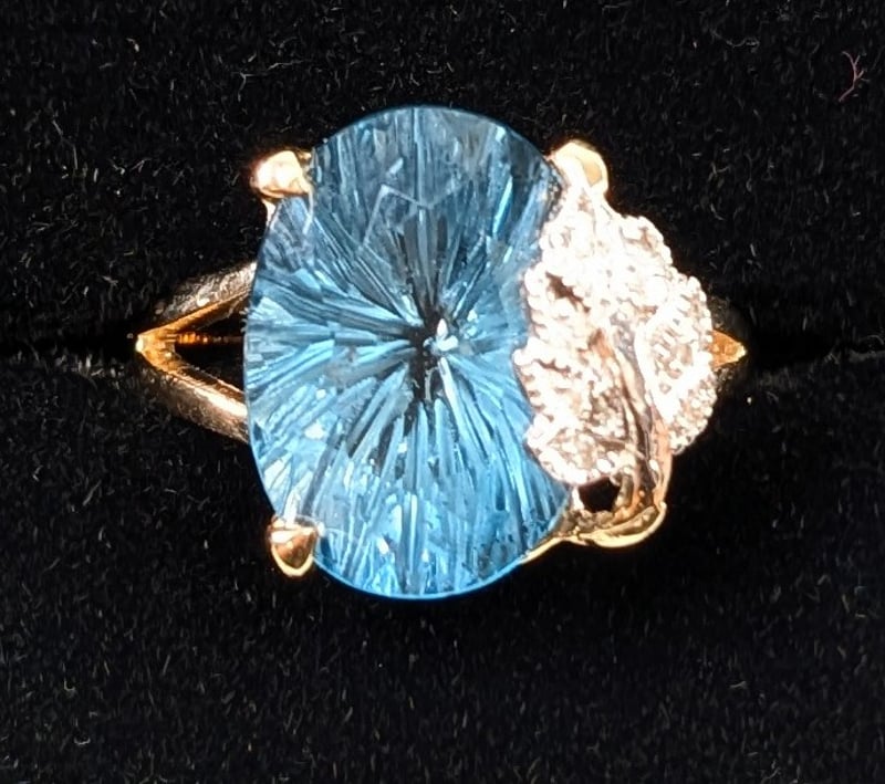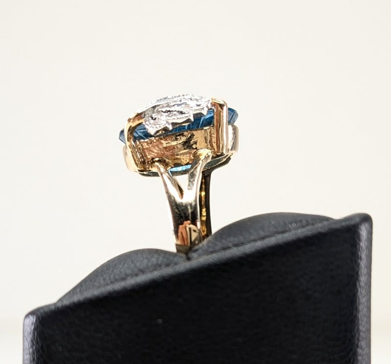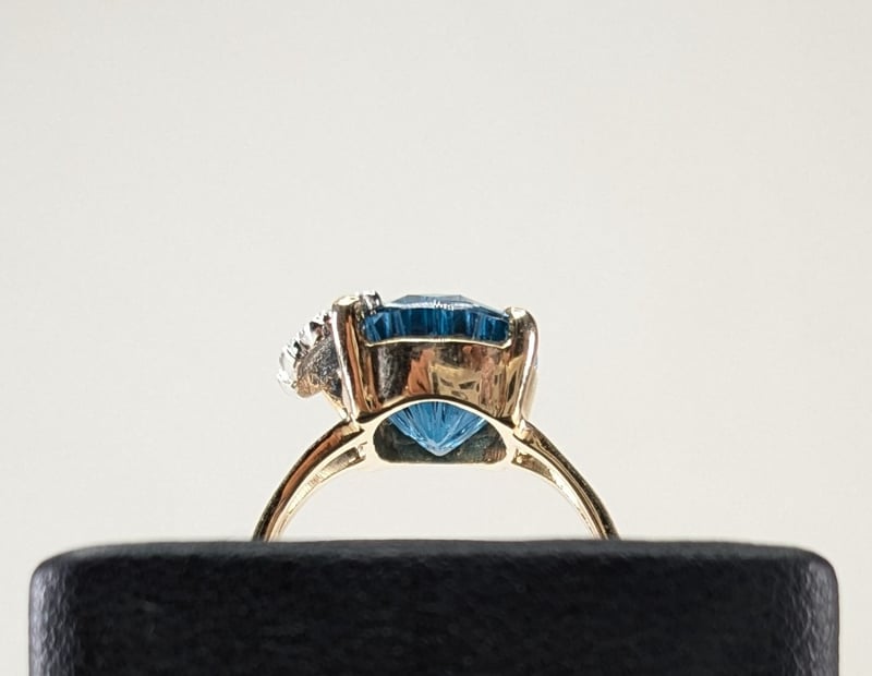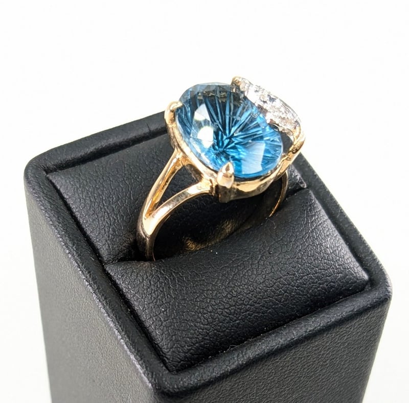 9CT YELLOW GOLD & RHODIUM PLATED TOPAZ & DIAMOND DRESS RING. Size M. 9Ct Yellow Gold & Rhodium Plated. Oval Faceted Cut Topaz, Swiss Blue, Slightly Included (N), 7Ct. 7 Claw Set Round Brilliant Cut Diamonds, G-H, Si1, 0.03Ct. Accompanied By Valuation Report No: 26008 Total Item Weight: 4.58g Dimensions: Height: 1.00mm, Width: 10.15mm, Depth: 6.70mm Condition: Good - Refer To Images This valuation has been conducted by an independent third-party professional. The valuation amount is an assessment by the issuing valuer and does not reflect the auction value of the item. Any inquiries regarding the valuation should be directed to the issuing valuer (refer to contact details on the certificate), as Lloyds Auctions has no affiliation or influence over the valuation, the valuer, or the stated amount. Insurance Replacement Valuation Amount: $9,000.00 CROSSDOCK 163041+9