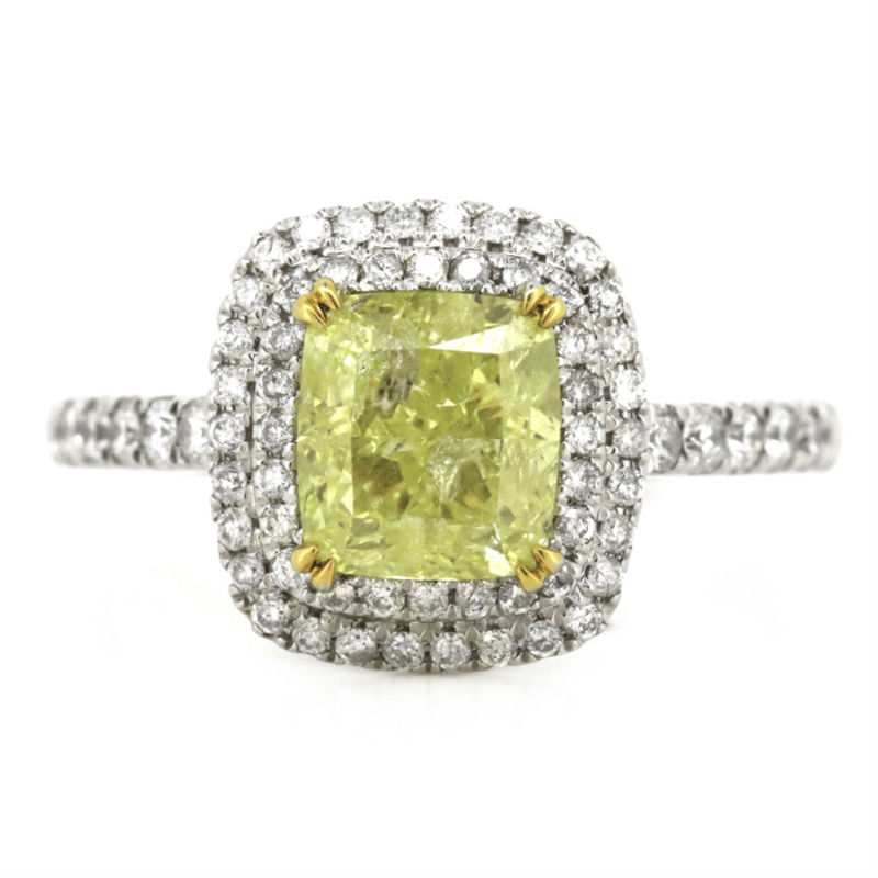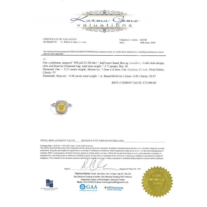 The Centre Features, One Cushion Cut, Vivid Yellow, Diamond (2.21Ct, P1 Clarity), Double 4 Claw Set In Yellow Gold. Surrounding The Centre In A Double Halo And Decorating The Band Are, 66 Round Brilliant Cut, Diamonds (0.46Ct Tdw, G-H Colour, Si-P1 Clarity), Bead Set. Ring Size M.