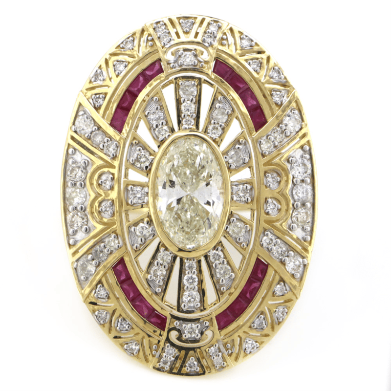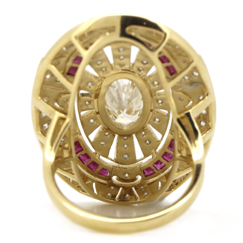 The Centre Features, One Oval Brilliant Cut, Diamond (2.02Ct, K-L Colour, P2 Clarity), Bezel Set. Accompanied By, 16 Square French Cut, Deep Pinkish-Red, Rubies (0.44Ct Tsw, Moderately Included, Enhanced), Channel Set. Embellishing The Design Are, 70 Round Brilliant Cut, Diamonds (0.81Ct Tdw, H-K Colour, P1+ Clarity), Bead Set. Ring Size O.