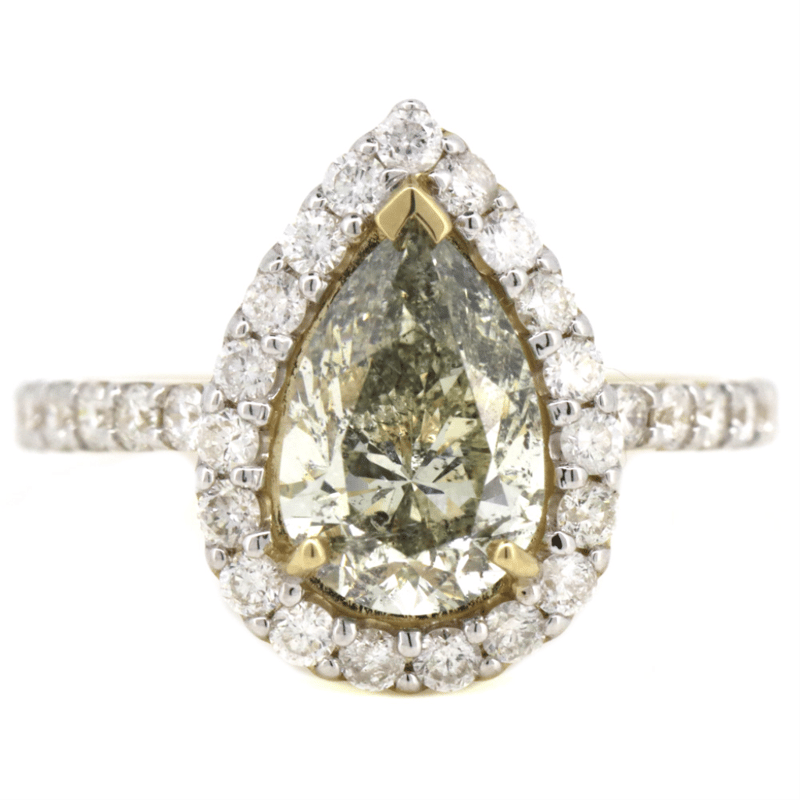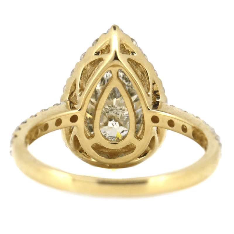 The Centre Features, One Pear Modified Brilliant Cut, Light Fancy Yellow, Diamond (2.02Ct, Tlb Colour, P2 Clarity), Claw Set. Surrounding The Centre In A Halo And Decorating The Band Are, 31 Round Brilliant Cut, Diamonds (0.65Ct Tdw, G-H Colour, Si1-Si2 Clarity, 1.70Mm), Pip-Claw Set. Ring Size M 1/2.