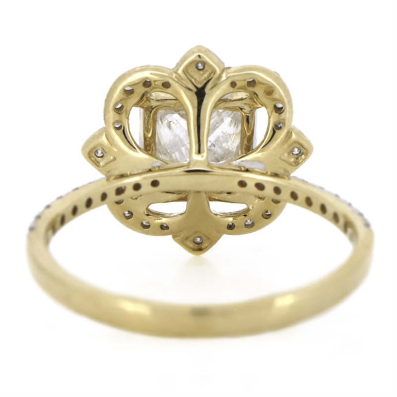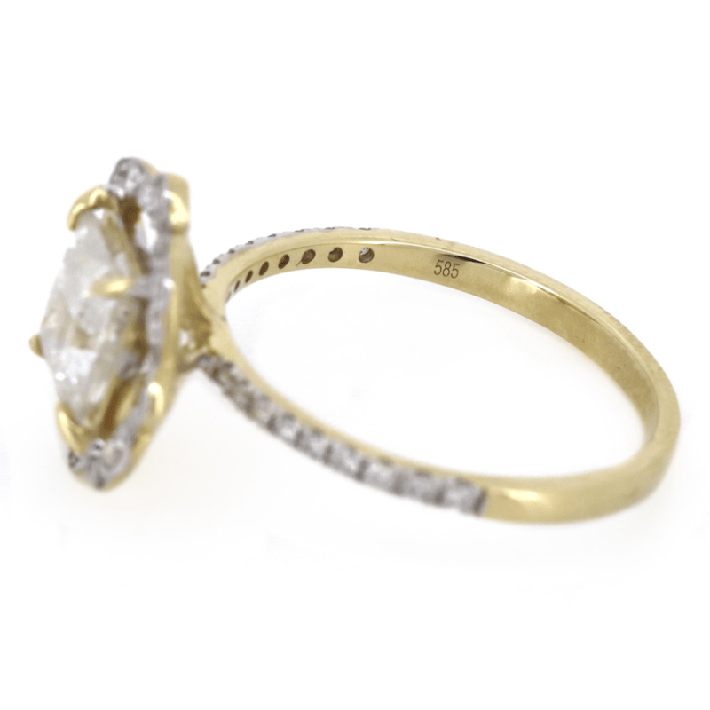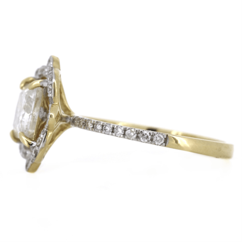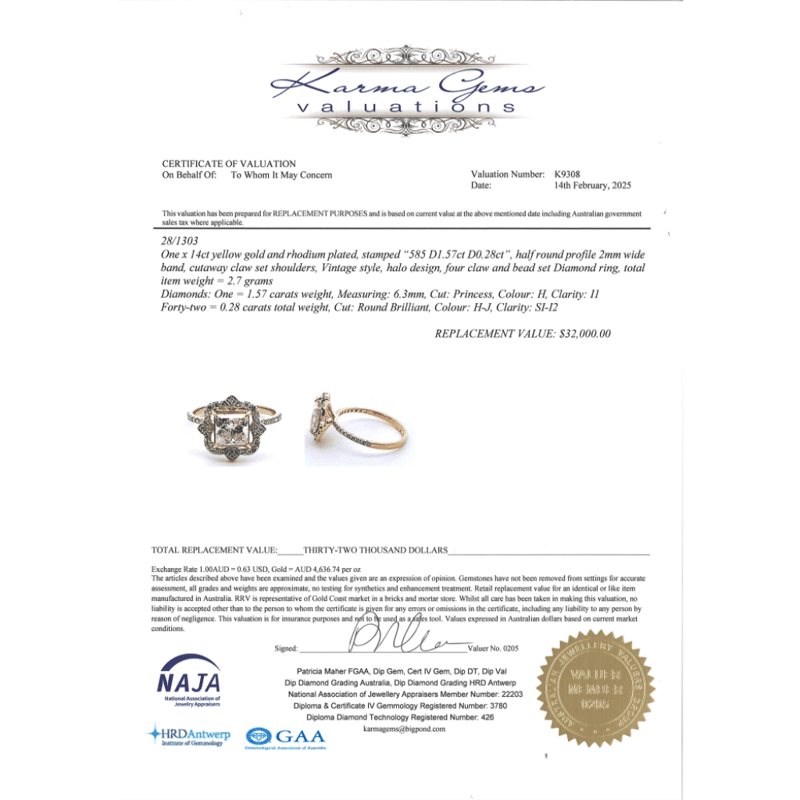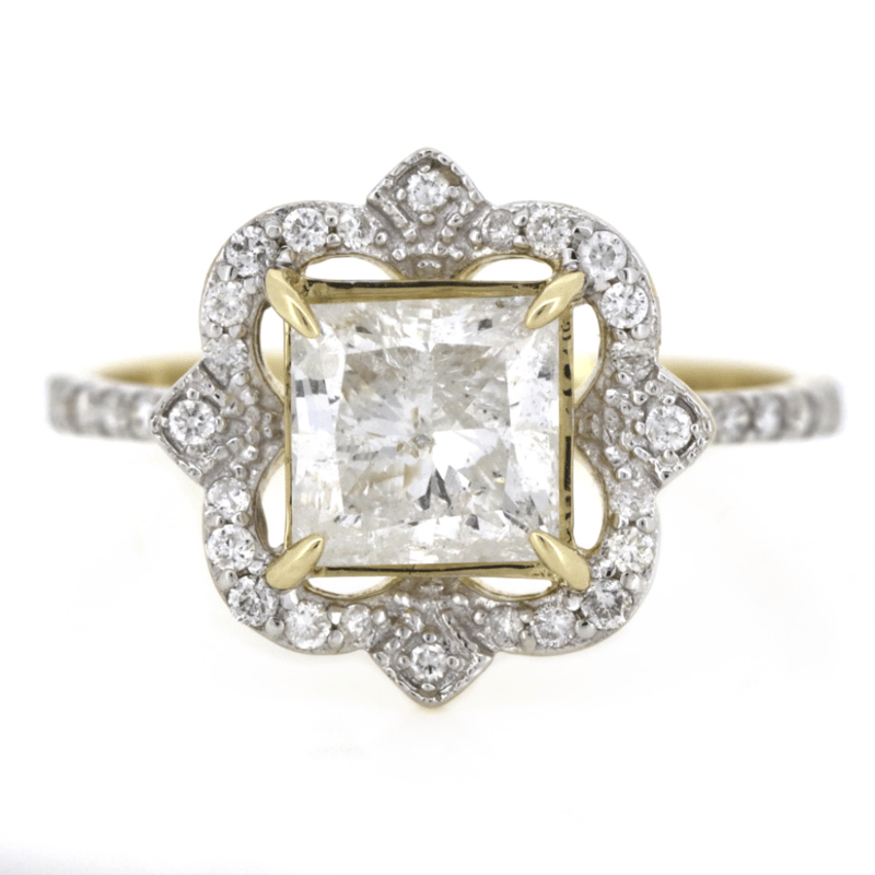 The Centre Features, One Princess Cut, Diamond (1.57Ct, H Colour, Si Clarity), 4 Claw Set. Encompassing The Centre Diamond Are, 42 Round Brilliant Cut, Diamonds (0.28Ct Tdw, H-J Colour, Si-I2 Clarity), Bead Set.