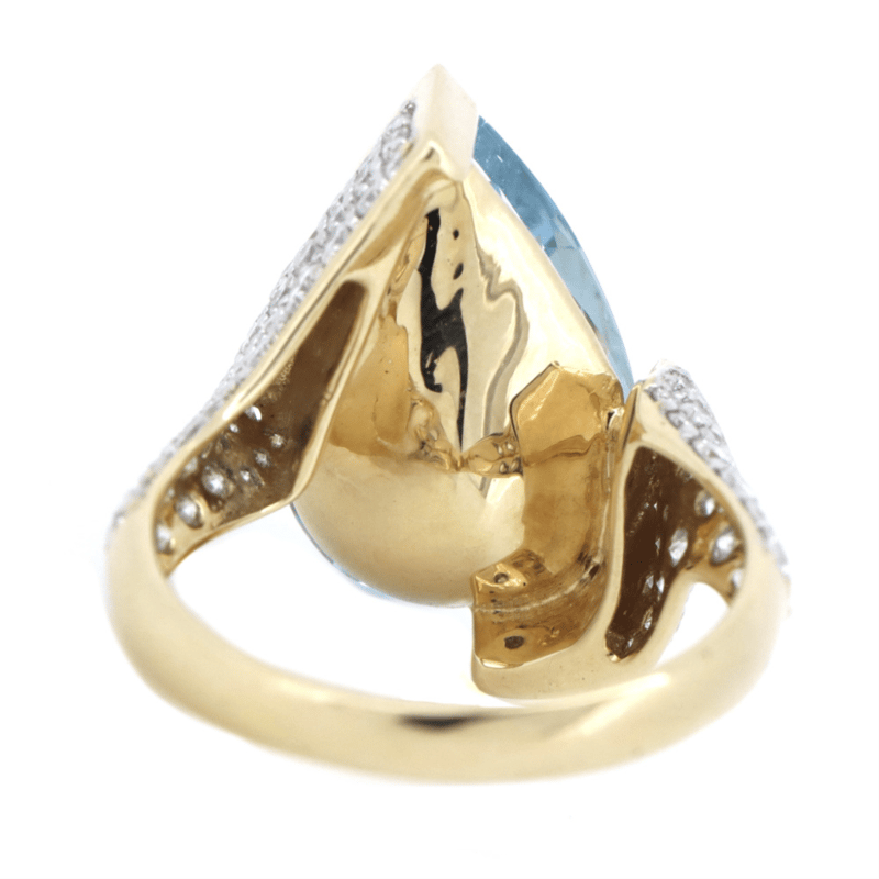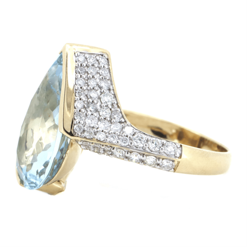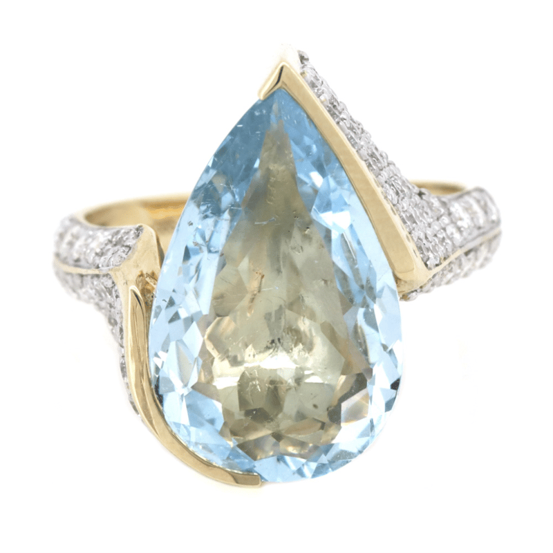 The Centre Design Features, One Pear Faceted Cut, Medium Blue, Aquamarine (6.93Ct, Slightly Included), Semi Bezel. Decorating The Band Are, 79 Round Brilliant Cut, Diamonds (1.04Ct Tdw, I-K Colour, Si2-P2 Clarity), Bead Set. Ring Size P.