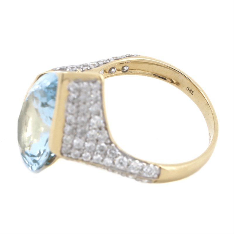 14K YELLOW GOLD, 6.93CT AQUAMARINE AND DIAMOND, COCKTAIL RING.