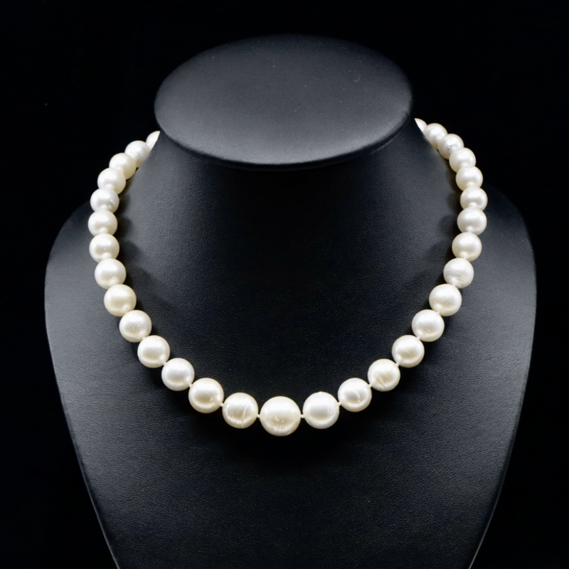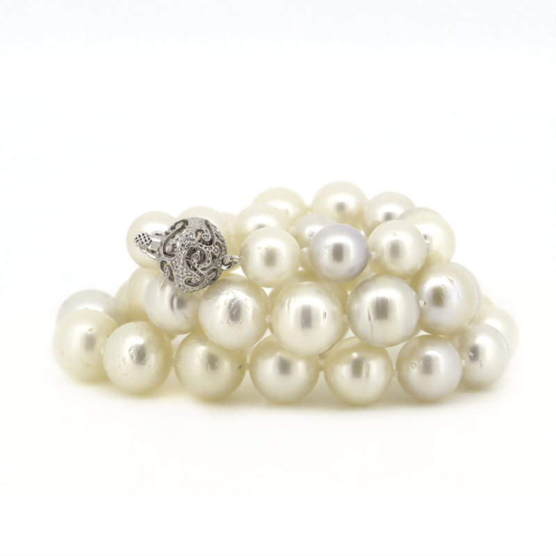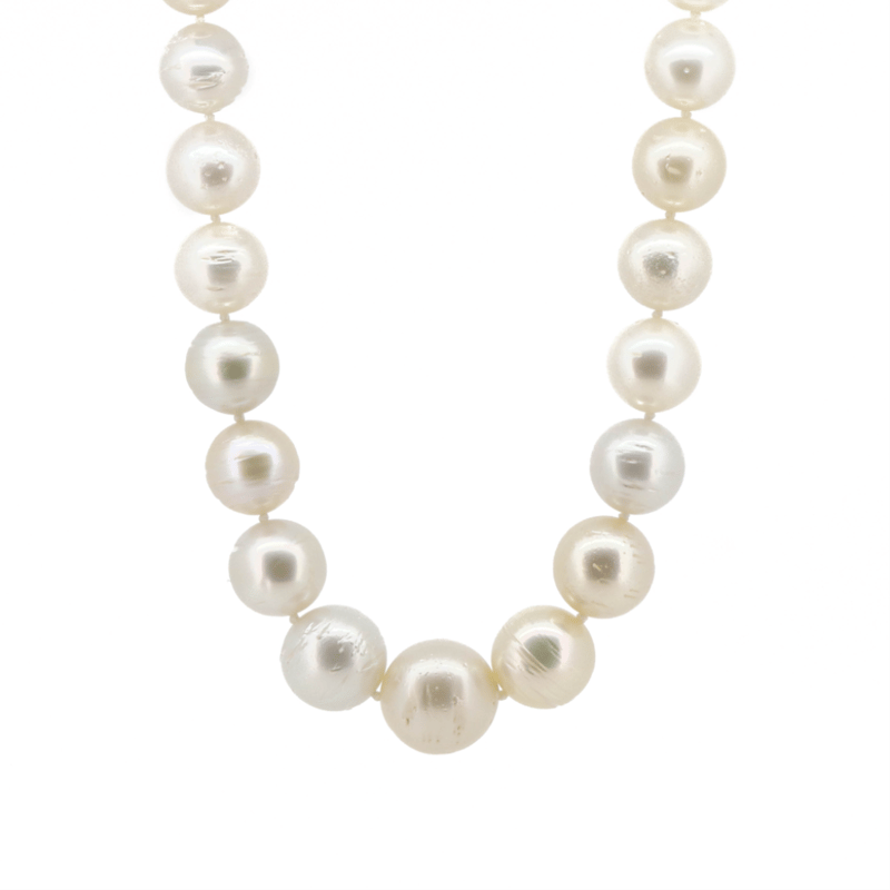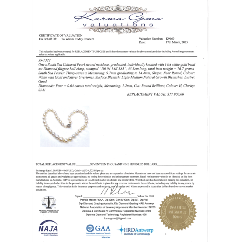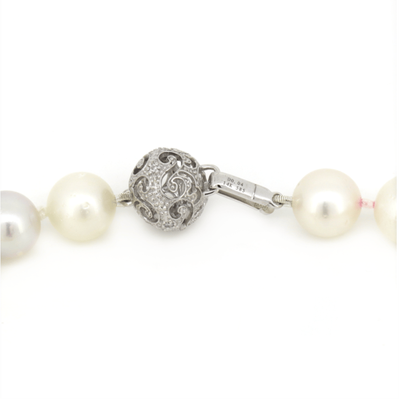 14K WHITE GOLD, WHITE CULTURED SOUTH SEA PEARL AND DIAMOND, STRAND NECKLACE. The Design Features, 37 Near Round, White With Gold And Silver Overtones, Cultured South Sea Pearls (9.70Mm-14.40Mm Graduating In Size, Good Lustre, Slightly-Medium Blemishes), Strung And Knotted. Embellishing The 14K White Gold Filigree Ball Clasp Are, 4 Round Brilliant Cut, Diamonds (0.04Ct Tdw, H Colour, Si-I1 Clarity), Bead Set. Necklace Length Is 44Cm. Valuations Provided by an Independent Third-Party Professional Not Directly Associated With Lloyds Auctions at AUD $$17,900.00This valuation has been conducted by an independent third-party professional. The valuation amount is an assessment by the issuing valuer and does not reflect the auction value of the item. Any inquiries regarding the valuation should be directed to the issuing valuer (refer to contact details on the certificate), as Lloyds Auctions has no affiliation or influence over the valuation, the valuer, or the stated amount. Condition: Good - Refer Images 0645887+5009